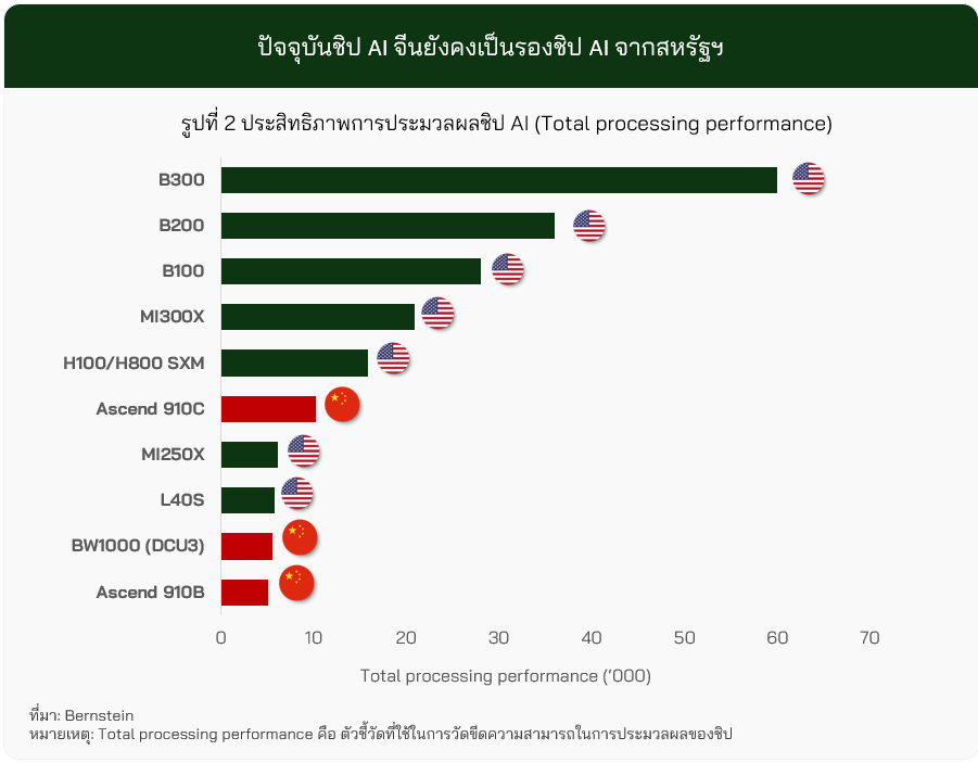 แม้ปัจจุบันจีนจะสามารถผลิตชิปประมวลผลขั้นสูงเองได้แล้ว แต่ประสิทธิภาพยังคงเป็นรองสหรัฐฯ (รูปที่ 2)