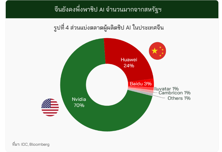 ปริมาณการนำเข้าชิปของจีนเพิ่มขึ้นต่อเนื่องในช่วงหลายปีที่ผ่านมา สะท้อนถึงความต้องการใช้งานที่ขยายตัวตามการเติบโตของอุตสาหกรรม AI (รูปที่ 3) โดยในปี 2024 ชิปจากสหรัฐฯ ครองส่วนแบ่งตลาดมากถึง 70% ของการใช้งานทั้งหมดในจีน ขณะที่การใช้งานชิปจากผู้ผลิตภายในประเทศยังมีจำกัด (รูปที่ 4)