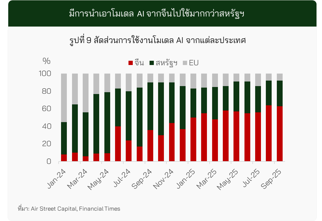 นอกจากนี้ หากพิจารณาการใช้งานโมเดล AI จะพบว่าจีนมีพัฒนาการที่โดดเด่นในช่วงปี 2024 – 2025 โดยสัดส่วนการนำโมเดลจากจีนไปใช้งานเพิ่มขึ้นต่อเนื่อง จนสามารถแซงหน้าสหรัฐฯ และยุโรปได้ (รูปที่ 9) ปัจจัยสำคัญมาจากยุทธศาสตร์ของรัฐบาลจีนที่เน้นการผลักดันโมเดล AI แบบเปิด (Open-source) เพื่อให้บริษัท นักพัฒนา และสถาบันต่างๆ สามารถนำเอาโมเดลไปใช้ หรือปรับแต่งได้อย่างอิสระ ส่งผลให้โมเดลของจีนแพร่กระจายในวงกว้างทั้งในประเทศและต่างประเทศ ในขณะที่ฝั่งสหรัฐฯ เน้นพัฒนาโมเดลแบบปิด (Closed-source) ที่เข้าถึงได้เฉพาะผ่าน API เท่านั้น ทำให้การนำไปใช้งานมีจำกัดกว่า