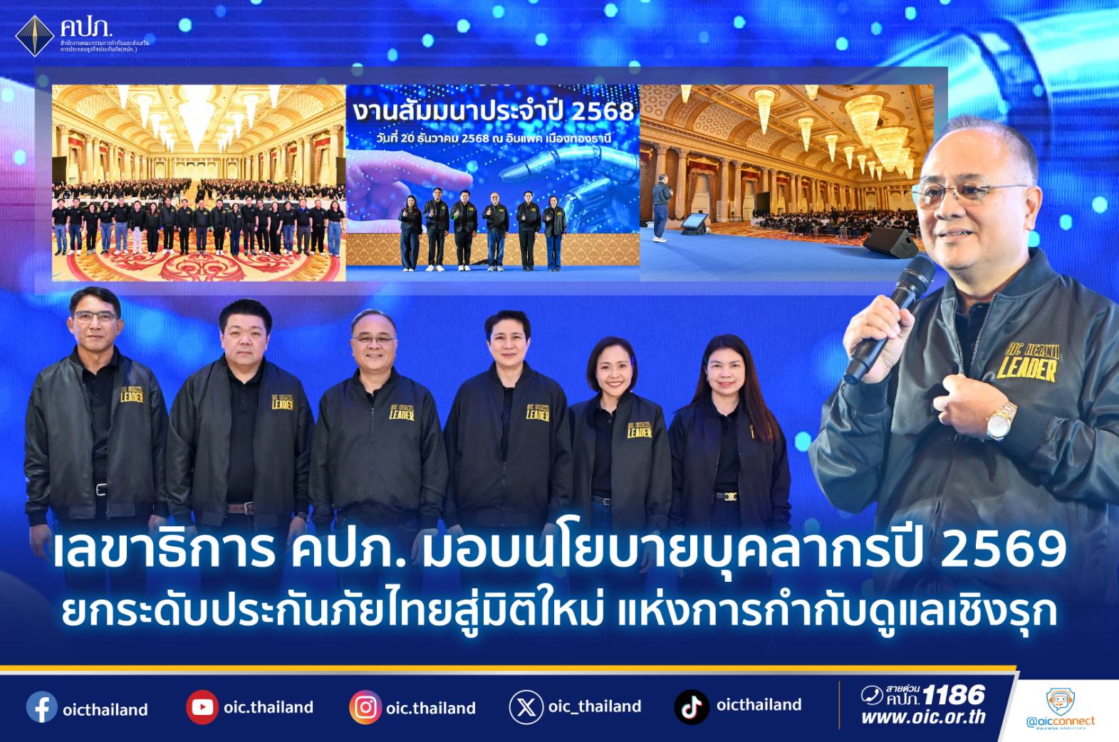 นายชูฉัตร ประมูลผล เลขาธิการคณะกรรมการกำกับและส่งเสริมการประกอบธุรกิจประกันภัย (เลขาธิการ คปภ.) เป็นประธานเปิดงานสัมมนาบุคลากร ประจำปี 2568 พร้อมมอบนโยบายและทิศทางการดำเนินงานของสำนักงานคณะกรรมการกำกับและส่งเสริมการประกอบธุรกิจประกันภัย (สำนักงาน คปภ.) ประจำปี 2569 ภายใต้แนวคิด “ยกระดับประกันภัยไทยสู่มิติใหม่แห่งการกำกับดูแลเชิงรุก จากวิกฤตสู่ความแข็งแกร่ง” โดยมีผู้บริหารระดับสูงและบุคลากรสำนักงาน คปภ. เข้าร่วมอย่างพร้อมเพรียง เมื่อวันที่ 20 ธันวาคม 2568 ณ ห้องรอยัล จูบิลี่ บอลรูม อิมแพค เมืองทองธานี จังหวัดนนทบุรี