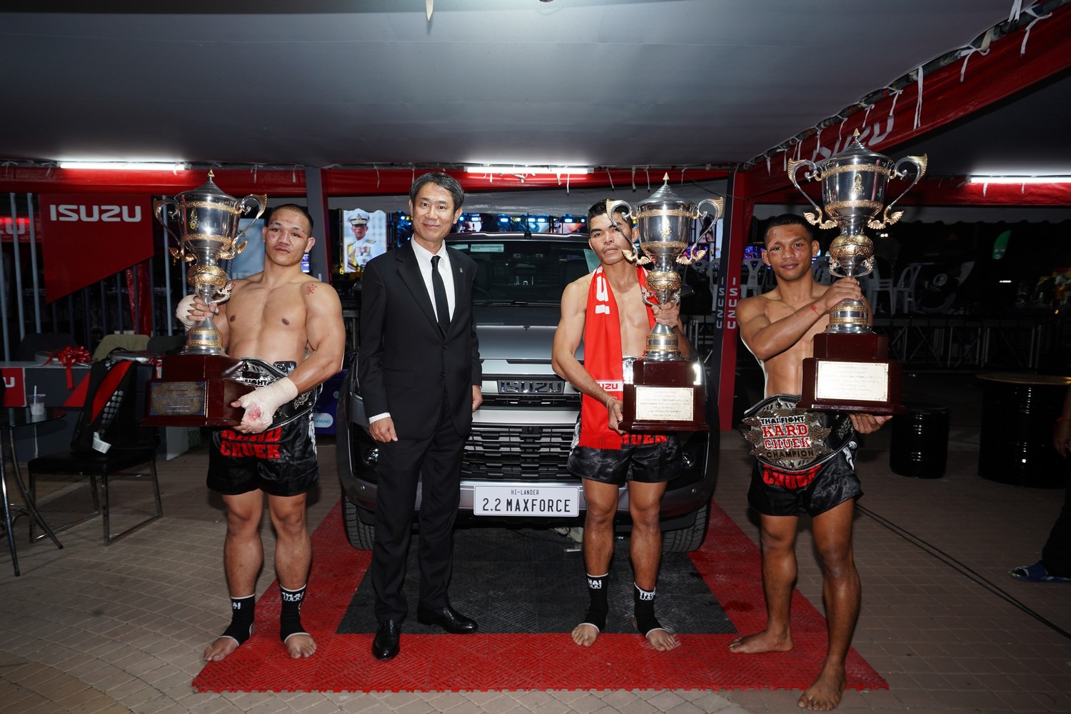 มร.ทาคาชิ ฮาตะ กรรมการผู้จัดการ บริษัท ตรีเพชรอีซูซุเซลส์ จำกัด กล่าวว่า “ขอแสดงความยินดีกับ จรวดศึก และ เขี้ยวเพชร ที่คว้าแชมป์ THAI FIGHT 2025 มาครองได้อย่างสง่างาม ด้วยหัวใจนักสู้ที่แข็งแกร่งจนได้รับพระราชทานถ้วยรางวัลอันทรงเกียรติ ซึ่งถือเป็นความสำเร็จอันน่าภาคภูมิใจในอาชีพนักชก ผมขออวยพรให้ทั้งสองท่านประสบความสำเร็จยิ่งขึ้นไปในอนาคต พร้อมกันนี้ ขอขอบคุณผู้ชมทุกท่านที่ให้การสนับสนุนรถอีซูซุ รายการ Isuzu Thailand Championship และ THAI FIGHT ด้วยดีเสมอมา ทุกแรงใจของท่านคือพลังสำคัญที่ขับเคลื่อนให้อีซูซุมุ่งมั่นพัฒนาอย่างไม่หยุดยั้ง และเราหวังเป็นอย่างยิ่งว่าจะได้รับความไว้วางใจจากทุกท่านเช่นนี้ตลอดไป”