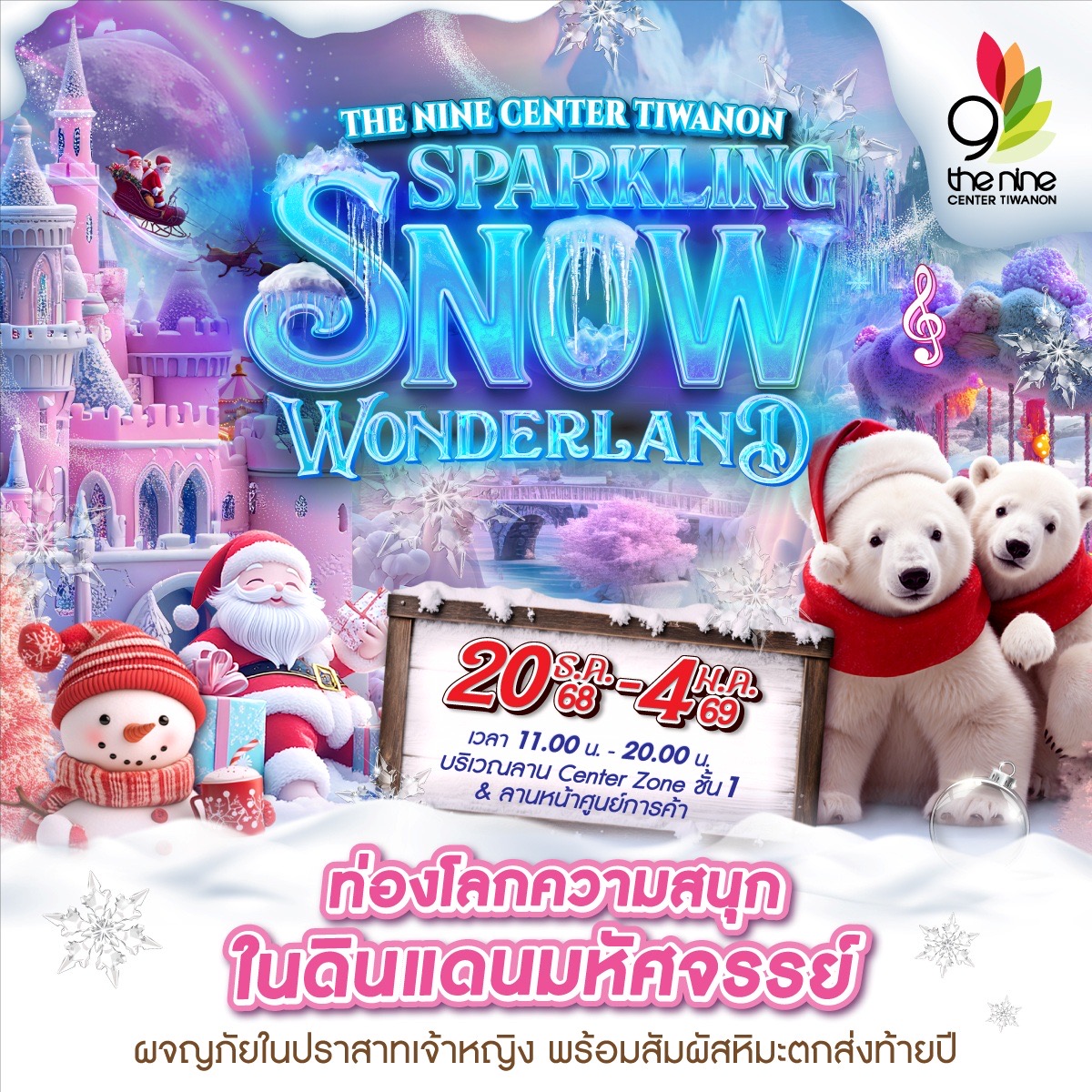 ชาวปทุมธานีชวนมาร่วมเก็บโมเมนต์ความประทับใจกับต้นคริสต์มาส กิจกรรมความบันเทิงครบเครื่องได้ที่ เดอะไนน์ เซ็นเตอร์ ติวานนท์ เนรมิตพื้นที่ให้กลายเป็นโลกแห่งเทพนิยาย Sparkling Snow Wonderland ตั้งแต่วันนี้ – 4 มกราคม 2569 เวลา 11.00 น. – 20.00 น. ท่องโลกความสนุกในดินแดนมหัศจรรย์ ผจญภัยใน “ปราสาทเจ้าหญิง” ขนาดยักษ์กว่า 15 เมตร บริเวณ Center Zone ชั้น 1 สนุกได้ฟรี!! สำหรับสมาชิก MBK PLUS เพียงแสดงใบเสร็จช้อป - อิ่ม ในศูนย์ฯ (ไม่จำกัดมูลค่า) ถ่ายรูปสุดฟินกับซานตาคลอสยักษ์ หมีโพลาร์ขนาดใหญ่ Snow Globe ยักษ์สุดตระการตา พร้อมสัมผัสหิมะตกกลางป่าสนต้นคริสต์มาส เวลา 17.30 น. และ 18.30 น. ลานด้านหน้าศูนย์ฯ