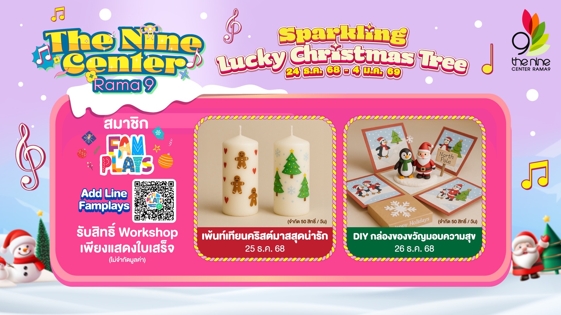 ส่วน เดอะไนน์ เซ็นเตอร์ พระราม 9 ชวนสมาชิก Fam Plays และทุกครอบครัวมาร่วมเติมเต็มความสุขช่วงเทศกาลส่งท้ายปี กับกิจกรรม Christmas Creative Workshop ที่ออกแบบมาเพื่อสร้างรอยยิ้ม ความทรงจำ และช่วงเวลาพิเศษร่วมกัน เพียงแสดงใบเสร็จช้อปหรืออิ่มในศูนย์ฯ (ไม่จำกัดมูลค่า) ก็สามารถเข้าร่วมกิจกรรมได้ทันที โดยวันที่ 25 ธันวาคม 2568 ชวนร่วมกิจกรรม เพ้นท์เทียนคริสต์มาส ออกแบบลวดลายในสไตล์ของตัวเอง เหมาะสำหรับมอบเป็นของขวัญเล็กๆ หรือเก็บไว้เป็นของที่ระลึกแทนความทรงจำดี ๆ ในช่วงเทศกาล ส่วนวันที่ 26 ธันวาคม 2568 ชวนมา DIY กล่องของขวัญมอบความสุข ออกแบบและตกแต่งกล่องของขวัญเพื่อคนพิเศษ นอกจากนี้สนุกกับ Happy Vibe & Troop ดื่มด่ำกับบทเพลง Christmas Carol ในวันที่ 24 - 25 ธันวาคม 2568 สนุกสุดหรรษากับขบวนทรูปส่งท้ายปีเก่าต้อนรับปีใหม่ในวันที่ 24 - 25 ,30 - 31 ธันวาคม 2568 และ 1 มกราคม 2569