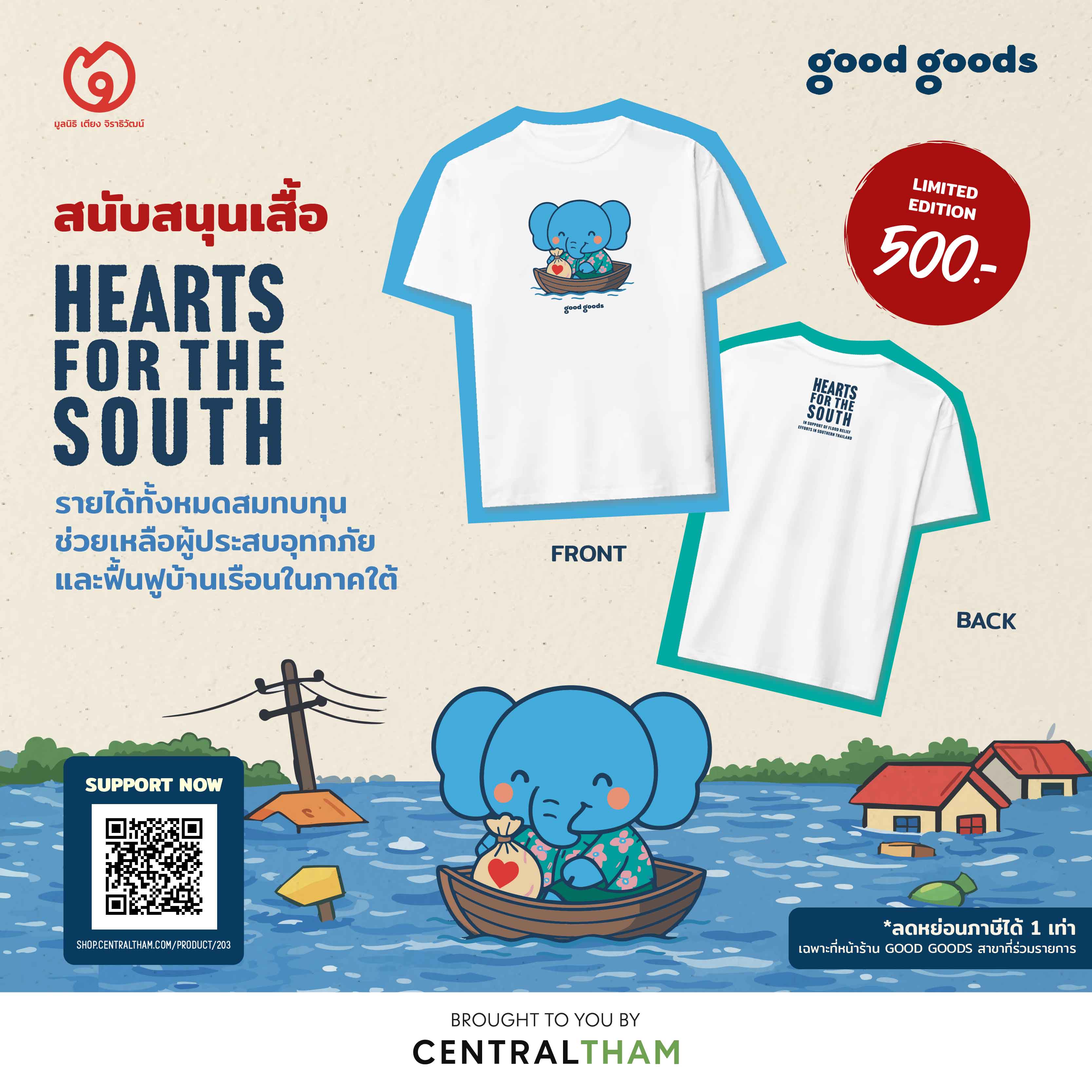 ทั้งนี้ ผู้ร่วมสนับสนุนทุกๆ 500 บาท จะได้รับ เสื้อยืด “Hearts For The South” 1 ตัว จากกุ๊ด กุ๊ดส์ เพื่อเป็นสัญลักษณ์แห่งการแบ่งปันและการมีส่วนร่วมในการช่วยเหลือสังคม ทั้งนี้ รายได้จากการสนับสนุนทั้งหมด ไม่หักค่าใช้จ่าย มอบให้แก่ มูลนิธิเตียง จิราธิวัฒน์ เพื่อนำไปจัดซื้อสิ่งจำเป็นและสนับสนุนการฟื้นฟูพื้นที่ประสบอุทกภัยหลังน้ำลด