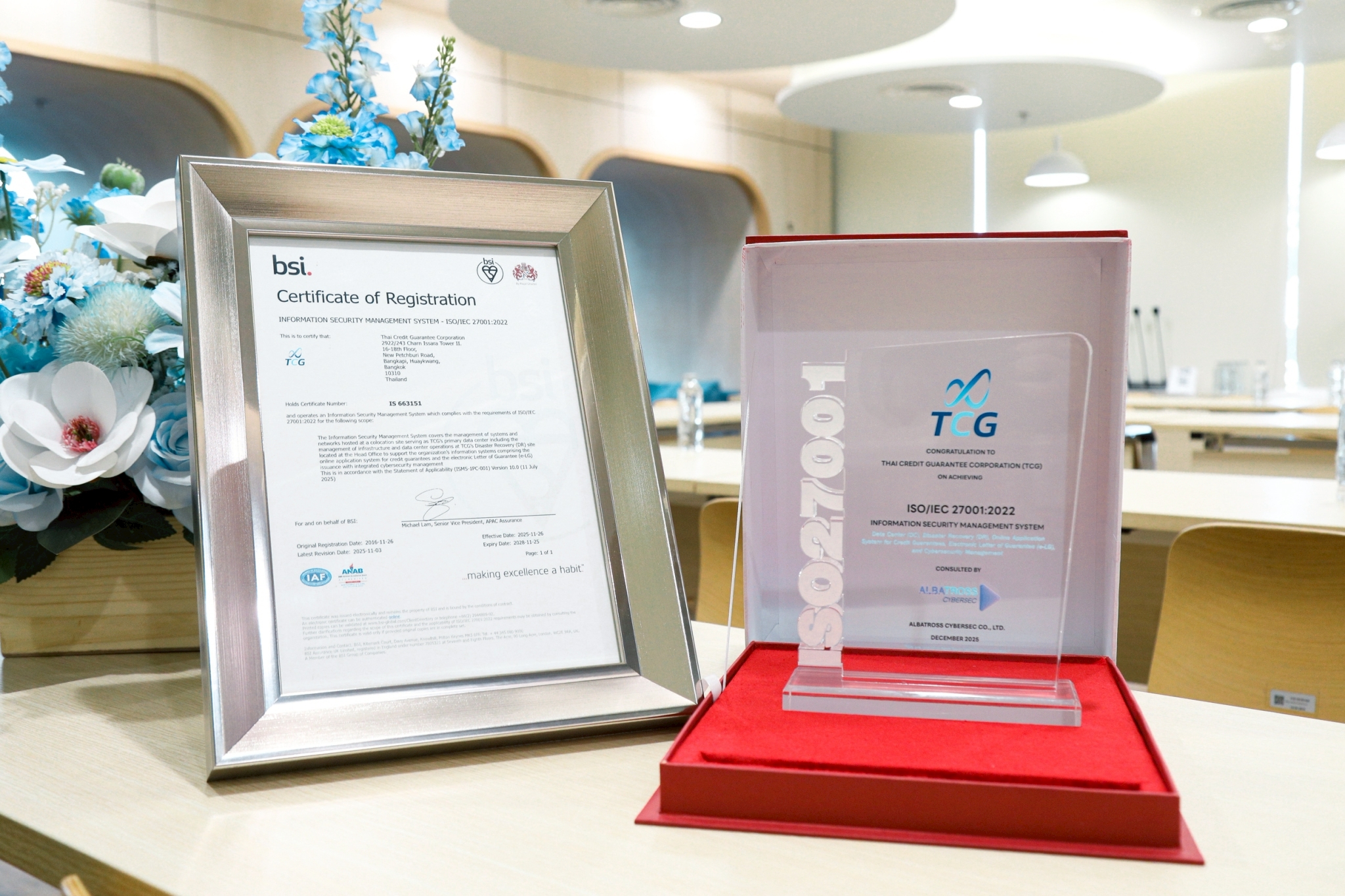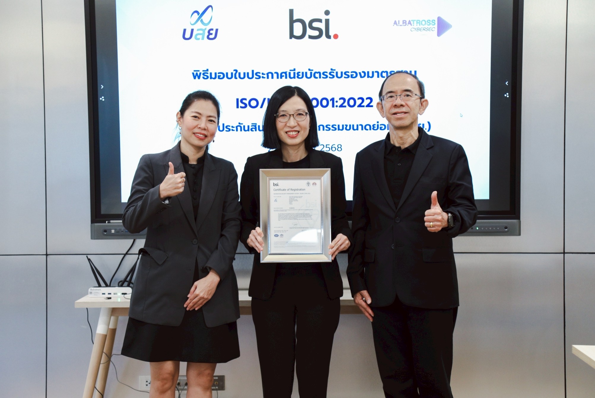 นางสาวสิริรัตน์ อร่ามเสรีวงศ์ รองผู้จัดการทั่วไป สายงานสารสนเทศและดิจิทัล บรรษัทประกันสินเชื่ออุตสาหกรรมขนาดย่อม (บสย.) เป็นประธานในพิธีมอบประกาศนียบัตรรับรองมาตรฐาน ระบบบริหารจัดการความมั่นคงปลอดภัยสารสนเทศ (ISMS) ISO/IEC 27001:2022 ร่วมด้วย นายศิษฎ์ วงศาริยะ รองผู้จัดการทั่วไป สายงานกำกับและบริหารความเสี่ยง คณะผู้บริหาร และทีมงานคณะทำงาน ISMS โดยได้รับเกียรติจากคุณปิยะอร รัศมีรุ่งเรืองทวี Sales & Marketing Director บริษัท บีเอสไอ กรุ๊ป (ประเทศไทย) จำกัด เป็นตัวแทนมอบประกาศนียบัตรรับรองมาตรฐาน ร่วมด้วยนางสาวจีราภา ทิพกรณ์ ประธานกรรมการบริหาร บริษัท อัลบาทรอส ไซเบอร์เซค จำกัด ที่ปรึกษาโครงการฯ มอบโล่และช่อดอกไม้ เพื่อแสดงความยินดี เมื่อวันที่ 23 ธันวาคม 2568 ณ TCG Learning Center ชั้น 2 อาคารชาญอิสสระทาวเวอร์ 2