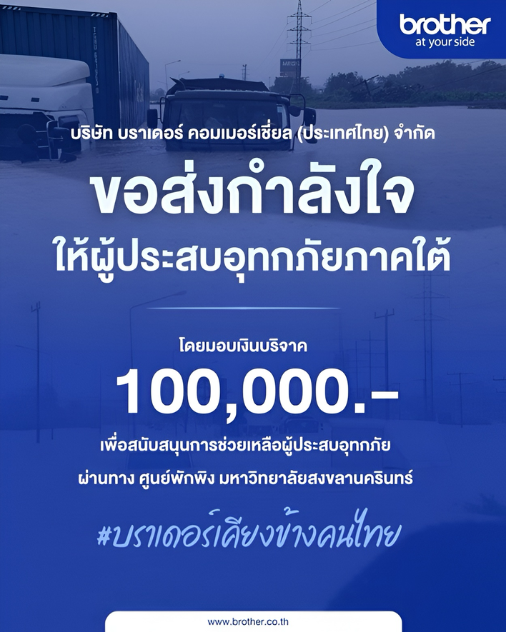 ทั้งนี้ จากสถานการณ์อุทกภัยในพื้นที่อำเภอหาดใหญ่ จังหวัดสงขลา และจังหวัดใกล้เคียงที่ผ่านมา ซึ่งส่งผลกระทบเป็นวงกว้าง Brother ได้เร่งระดมทรัพยากรเข้าช่วยเหลือในระยะฉุกเฉินอย่างเร่งด่วนและตรงจุด โดยได้มอบเงินสนับสนุนจำนวน 100,000 บาท ให้แก่ ศูนย์พักพิงผู้ประสบภัย มหาวิทยาลัยสงขลานครินทร์ (ม.อ.) ซึ่งนับเป็นศูนย์พักพิงขนาดใหญ่ที่สุดในเหตุการณ์ครั้งนี้ ที่รองรับผู้ประสบภัยสูงสุดถึง 14,000 คน โดยการสนับสนุนดังกล่าวได้ถูกนำไปบริหารจัดการดูแลชีวิตความเป็นอยู่ของผู้ประสบภัยอย่างครบวงจร ทั้งด้านอาหาร เครื่องนุ่งห่ม ที่พักอาศัย ระบบการสื่อสาร และการดูแลทางการแพทย์ที่ขยายศักยภาพเป็นโรงพยาบาลสนาม เพื่อรองรับผู้เจ็บป่วยได้อย่างทันท่วงที โดยล่าสุดที่สถานการณ์เริ่มคลี่คลายและผู้ประสบภัยส่วนใหญ่ทยอยกลับที่พักอาศัย ทาง ม.อ. จึงได้ปรับเปลี่ยนรูปแบบการดำเนินงานเข้าสู่ระยะฟื้นฟู โดยเตรียมแผนงานร่วมกับหน่วยงานภาครัฐ อาทิ กระทรวงการพัฒนาสังคมและความมั่นคงของมนุษย์ (พม.) และ องค์การบริหารส่วนจังหวัด (อบจ.) เพื่อส่งต่อความช่วยเหลือไปยังกลุ่มเปราะบาง รวมถึงการลงพื้นที่ฟื้นฟูชุมชนให้กลับสู่สภาวะปกติในลำดับต่อไป