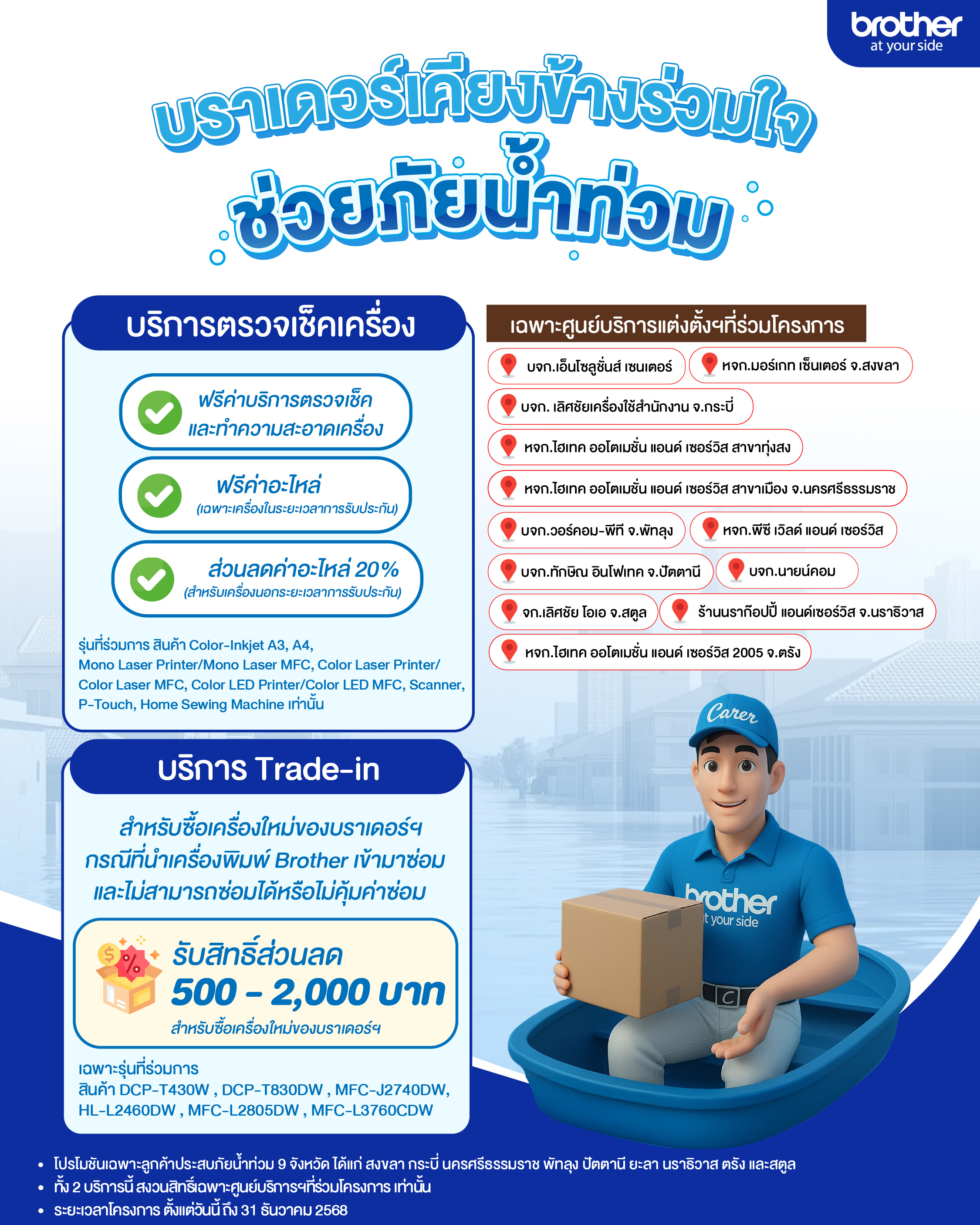 มาตรการสนับสนุนการซื้อเครื่องใหม่ (ไม่ต้องแลกซากปริ้นเตอร์) มอบส่วนลดพิเศษสูงสุด 2,000 บาท ให้แก่ลูกค้าผู้ประสบภัยเพื่อแบ่งเบาภาระในการจัดหาอุปกรณ์ทดแทน โดยลูกค้าสามารถรับสิทธิ์ส่วนลดได้ทันทีโดยไม่ต้องนำเครื่องที่เสียหายมาแลกคืน ครอบคลุมรุ่นยอดนิยมทั้งอิงค์เจ็ทและเลเซอร์ปริ้นเตอร์ 8 รุ่น ประกอบด้วย รุ่น MFC-L3760CDW รับส่วนลด 2,000 บาท, รุ่น DCP-T830DW และ MFC-J2740DW รับส่วนลด 1,000 บาท และรับส่วนลด 500 บาท สำหรับรุ่น DCP-T230, DCP-T430W, DCP-T530DW, HL-L2460DW และ MFC-L2805DW โดยจำกัดสิทธิ์ 30 เครื่อง/ร้านค้า/เดือน) เริ่มตั้งแต่วันที่ 10 ธันวาคม 2568 จนถึงวันที่ 31 มกราคม 2569