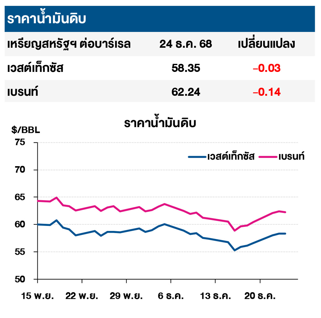 (-) ราคาน้ำมันดิบปรับลด หลังปริมาณการส่งออกน้ำมันดิบของรัสเซียสำหรับสัปดาห์สิ้นสุด ณ วันที่ 21 ธ.ค. 68 ปรับขึ้นมาอยู่ที่ระดับ 3.87 ล้านบาร์เรลต่อวัน ซึ่งถือเป็นระดับที่สูงที่สุดนับตั้งแต่เดือน พ.ค.66 อย่างไรก็ดี การนำเข้าน้ำมันดิบรัสเซียของจีนและรัสเซียยังคงเผชิญกับความไม่แน่นอนจากมาตรคว่ำบาตรครั้งล่าสุดของรัฐบาลสหรัฐฯ ส่งผลให้ล่าสุดปริมาณน้ำมันดิบของรัสเซียซึ่งลอยลำอยู่ในทะเลอยู่ที่ระดับ 185 ล้านบาร์เรล