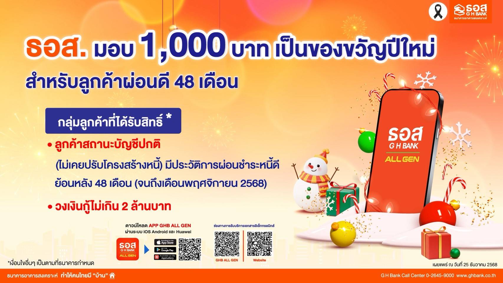 ธนาคารอาคารสงเคราะห์ (ธอส.) ตอบแทนลูกค้าสถานะบัญชีปกติที่มีวงเงินกู้ไม่เกิน 2 ล้านบาท และมีประวัติการผ่อนชำระเงินงวดสินเชื่อบ้านย้อนหลังรวม 48 เดือนอย่างสม่ำเสมอ นับถึงงวดเดือนพฤศจิกายน 2568 และชำระเงินงวดผ่าน Application : GHB ALL GEN ติดต่อกัน 2 เดือน (ในงวดเดือนธันวาคม 2568 และเดือนมกราคม 2569) รับเงิน 1,000 บาท เป็นของขวัญปีใหม่ 2569 ลูกค้าให้ยินยอมรับเอกสารอิเล็กทรอนิกส์เพื่อรับโอนเงินรอบแรกเดือนมกราคม 2569