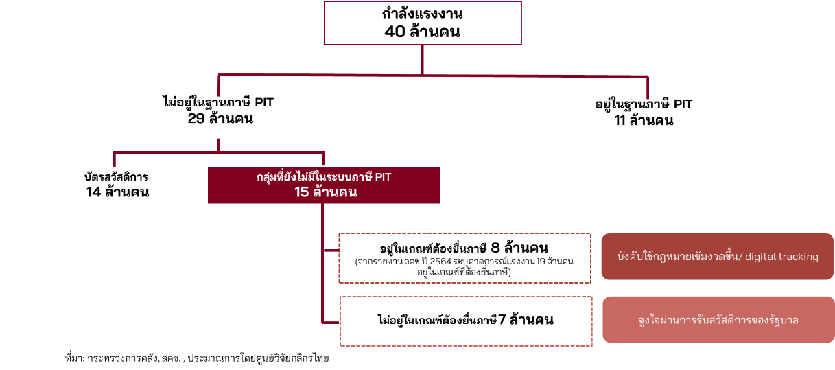 รัฐบาลควรผลักดันให้ทุกคนเข้ามาอยู่ในฐานภาษี โดยปัจจุบันมีจำนวนคนที่ยื่นแบบแสดงรายการภาษีเงินได้บุคคลธรรมดา (ภ.ง.ด.) อยู่ 11 ล้านคน จากตัวเลขกำลังแรงงานของไทยทั้งสิ้นราว 40 ล้านคน ส่งผลให้อีก 29 ล้านคน ยังไม่ได้อยู่ในฐานภาษีของรัฐบาล (รูปที่ 10) ซึ่งรัฐบาลต้องมีการปฏิรูปในส่วนของกฎหมายและโครงสร้างสวัสดิการ ดังมีรายละเอียดดังนี้
