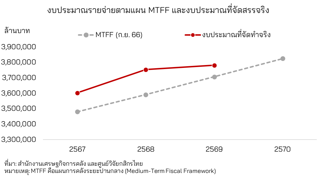 แผนการคลังระยะปานกลางปี 2570-2573 ที่คณะรัฐมนตรีมีมติเห็นชอบเมื่อวันที่ 18 พ.ย. 2568 แสดงให้เห็นถึงความตั้งใจของรัฐบาลที่จะลดการขาดดุลงบประมาณให้ต่ำกว่า 3.0% ต่อ GDP ในปี 2572 แต่ความเสี่ยงที่ไทยจะถูกปรับลดอันดับความน่าเชื่อถือในระยะข้างหน้ายังคงมีอยู่ ด้วยเหตุผลดังนี้