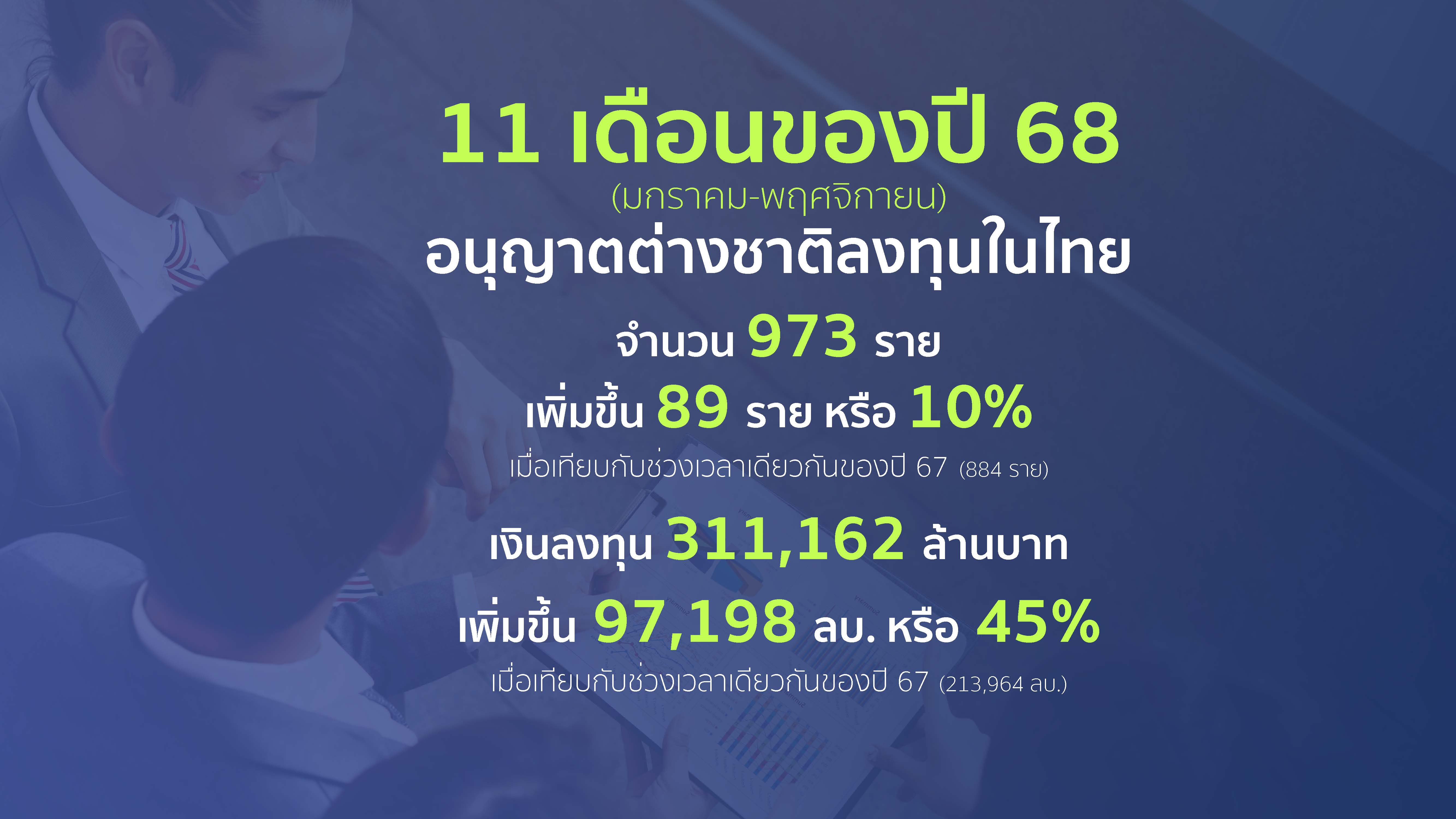 เมื่อเปรียบเทียบกับช่วงเวลาเดียวกันของปี 2567 พบว่า การอนุญาตให้คนต่างชาติเข้ามาลงทุนประกอบธุรกิจในประเทศไทย เพิ่มขึ้น 89 ราย (10%) (เดือน ม.ค. - พ.ย. 68 อนุญาต 973 ราย / เดือน ม.ค. - พ.ย. 67 อนุญาต 884 ราย) และมีมูลค่าการลงทุนเพิ่มขึ้น 97,198 ล้านบาท (45%) (เดือน ม.ค. - พ.ย. 68 ลงทุน 311,162 ล้านบาท / เดือน ม.ค. - พ.ย. 67 ลงทุน 213,964 ล้านบาท) รวมถึงมีการจ้างงานคนไทยจากนักลงทุนที่ขอรับใบอนุญาตประกอบธุรกิจของคนต่างด้าวรวม 5,718 คน ซึ่งเพิ่มขึ้นจากปีก่อน 2,047 คน (56%) (เดือน ม.ค. - พ.ย. 68 จ้างงาน 5,718 คน / เดือน ม.ค. - พ.ย. 67 จ้างงาน 3,671 คน) โดยจำนวนนักลงทุนที่เข้ามาสูงสุดยังคงเป็นนักลงทุนญี่ปุ่นเช่นเดียวกับปีก่อน