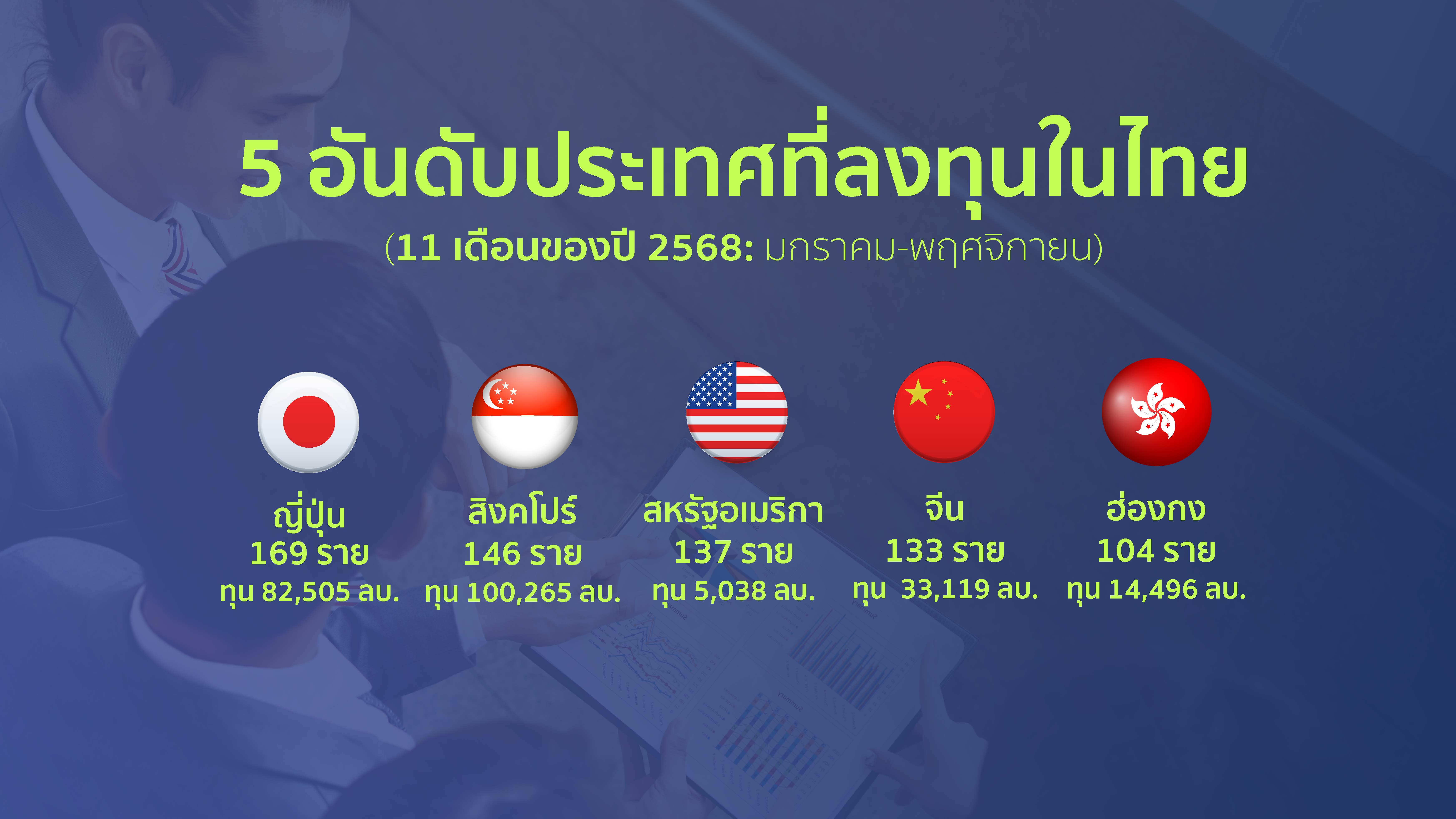 นายพูนพงษ์ นัยนาภากรณ์ อธิบดีกรมพัฒนาธุรกิจการค้า กระทรวงพาณิชย์ ในฐานะเลขานุการคณะกรรมการการประกอบธุรกิจของคนต่างด้าว เปิดเผยว่า ช่วง 11 เดือนของปี 2568 (มกราคม - พฤศจิกายน) มีการอนุญาตให้คนต่างชาติเข้ามาลงทุนประกอบธุรกิจในประเทศไทย ภายใต้พระราชบัญญัติการประกอบธุรกิจของคนต่างด้าว พ.ศ. 2542 จำนวน 973 ราย โดยเป็นการลงทุนผ่านช่องทางการขอรับใบอนุญาตประกอบธุรกิจของคนต่างด้าว 263 ราย และการขอหนังสือรับรองการประกอบธุรกิจของคนต่างด้าว (ผ่านช่องทางการลงทุนตามกฎหมายว่าด้วยการส่งเสริมการลงทุน หรือได้รับอนุญาตตามกฎหมายว่าด้วยการนิคมอุตสาหกรรมแห่งประเทศไทย และการใช้สิทธิตามสนธิสัญญาหรือความตกลงระหว่างประเทศ) 710 ราย มูลค่าเงินลงทุนรวมทั้งสิ้น 311,162 ล้านบาท โดยมีจำนวนชาวต่างชาติที่เข้ามาลงทุน 5 อันดับแรก ได้แก่