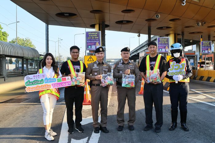 วันนี้ บมจ.ทางยกระดับดอนเมือง หรือ DMT นำโดย ดร.สัณห์ พันธ์อุไร (คนที่2จากขวา) ผู้ช่วยรองกรรมการผู้จัดการสายงานปฏิบัติการและนาย นพพล โพธิ์ขี (คนที่2จากซ้าย) ผอ.ฝ่ายพัฒนาธุรกิจและกลยุทธ์เพื่อความยั่งยืน พร้อมด้วย พล.ต.ต.ดำรงศักดิ์ สว่างงาม (คนที่3จากขวา) ผบก.จร. และ พ.ต.อ.ณัฐพงษ์ เชื้อเดช (คนที่3จากซ้าย) รอง ผบก.จร. ให้เกียรติร่วมมอบกระเป๋ากันง่วง “เที่ยวปีใหม่ทั่วไทย ปลอดภัยไปกับโทล์ลเวย์” กับทีมDMT เพื่อแทนความห่วงใยและร่วมรณรงค์ขับขี่อย่างมีวินัย เพื่อความปลอดภัยในการใช้รถใช้ถนนอย่างยั่งยืน ณ ด่านดินแดง 1 ทางยกระดับอุตราภิมุข