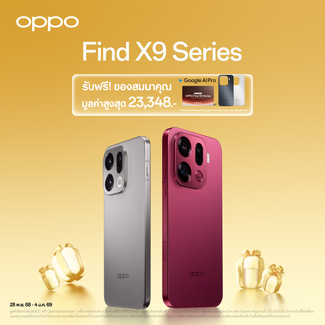 โดยเมื่อซื้อ OPPO Find X9 Pro และ OPPO Find X9 รับฟรี E-VIP Card ประกันจอแตก 1 ครั้ง ภายในระเวลา 2 ปี, ฟรี Google AI Pro 3 เดือน, Light Luxury Magnetic Case มูลค่ารวม 23,348 บาท และมูลค่ารวม 19,348 บาท ตามลำดับ ตั้งแต่วันนี้ ถึง 4 มกราคม 2569 ที่ OPPO Brand Shop และตัวแทนจำหน่ายทั่วประเทศ