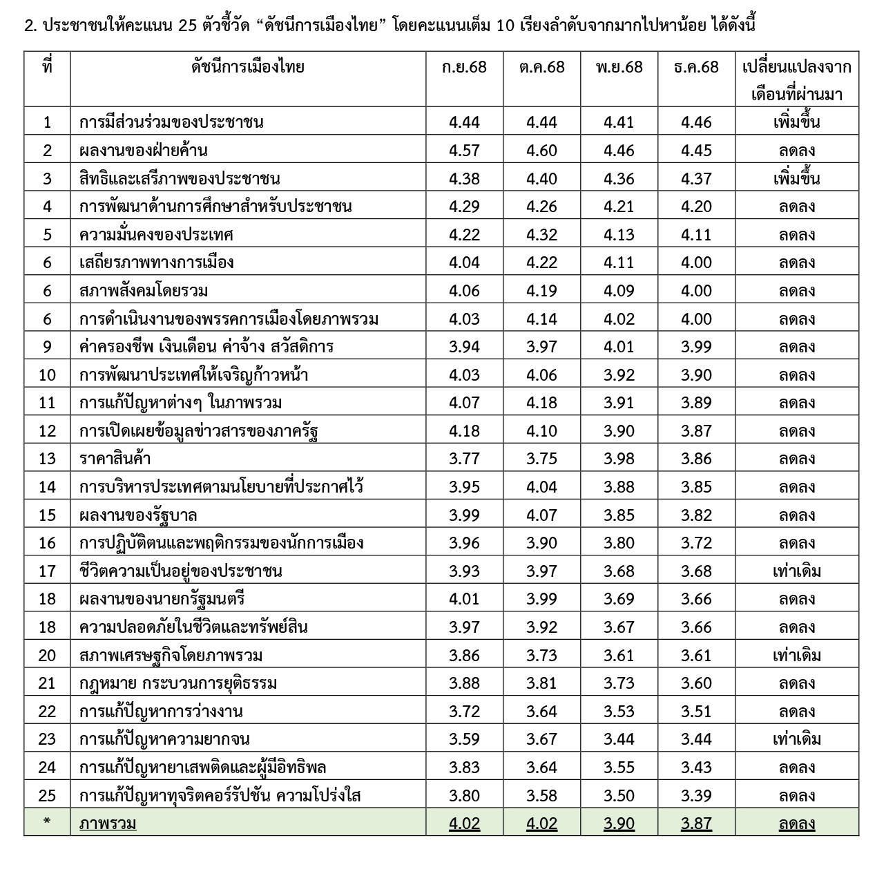 1. “ดัชนีการเมืองไทย” เดือนธันวาคม 2568 ภาพรวมคะแนนเต็ม 10 ได้ 3.87 คะแนน (เดือนพฤศจิกายน 2568 ได้ 3.90 คะแนน)