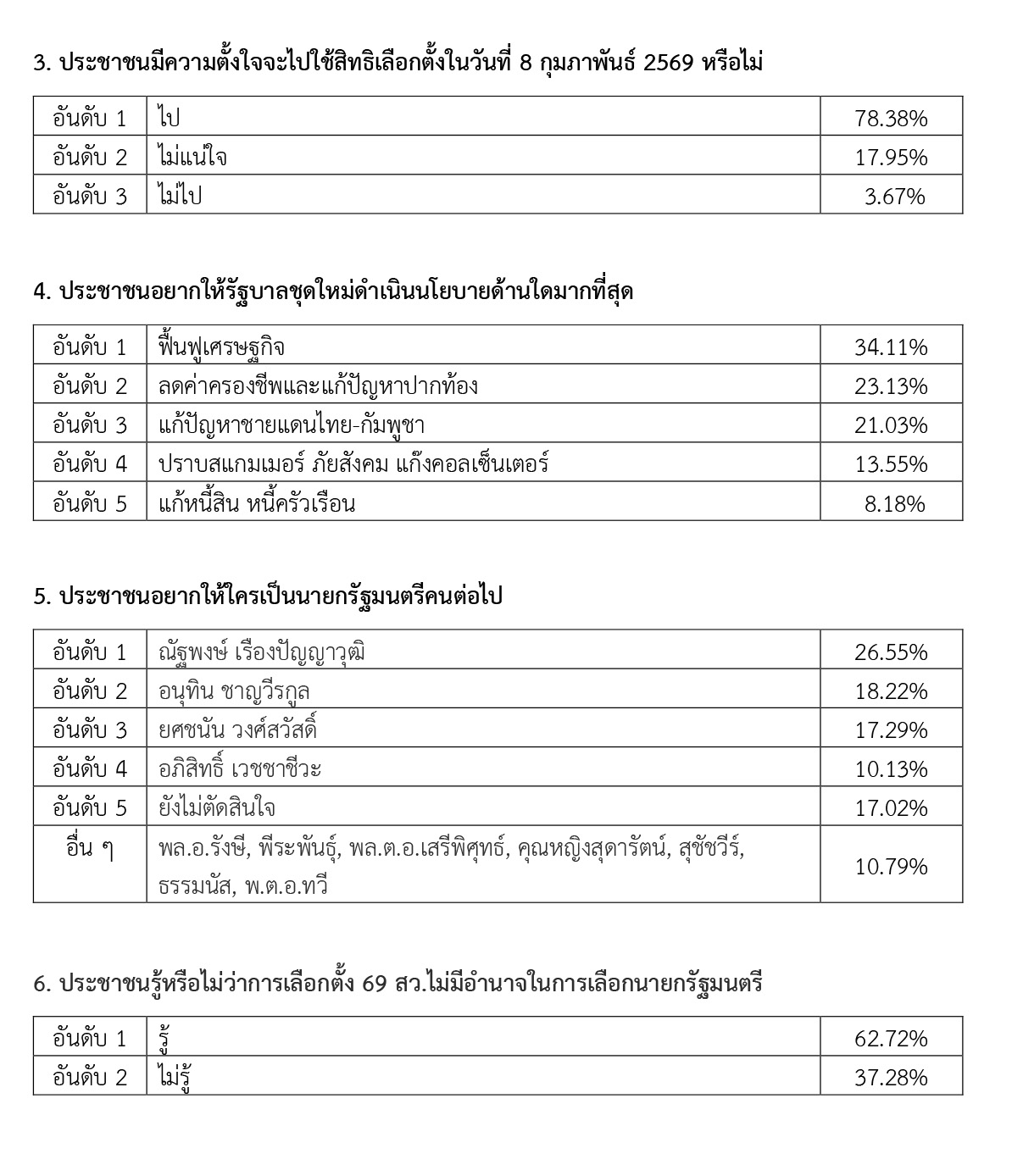 ต้องการอันดับต้นล้วนเป็นเรื่องเศรษฐกิจ ปากท้อง ความปลอดภัย และปัญหาชายแดน สะท้อนการเลือกตั้งครั้งนี้เป็นการโหวตจากความกังวล มากกว่าการโหวตจากอุดมการณ์ ประชาชนเกือบหนึ่งในห้ายังลังเลต่อทางเลือกผู้นำ และที่น่ากังวลใจอย่างยิ่ง คือ กว่า 37% ยังไม่ทราบว่า สว. ไม่มีอำนาจเลือกนายกรัฐมนตรี แสดงว่าประชาชนยังไม่เข้าใจบทบาทที่แท้จริงของ สว. และ นี่คือภาพของประชาธิปไตยเชิงพิธีกรรมที่ประชาชนยังเข้าไม่ถึงโครงสร้างอำนาจ ดังนั้น การเลือกตั้ง 2569 จึงเป็นการทดสอบว่าระบบการเมืองยังพาประเทศไปสู่ความมั่นคงได้จริงหรือไม่