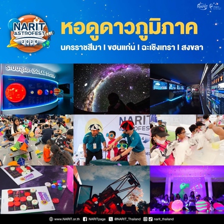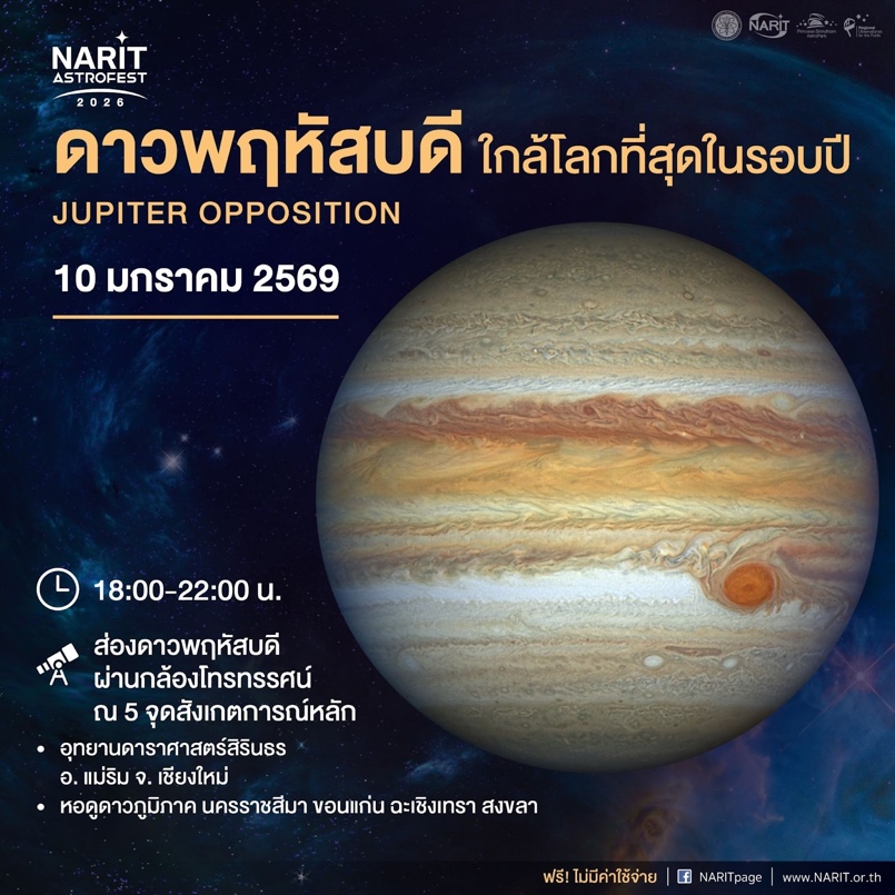 สถาบันวิจัยดาราศาสตร์แห่งชาติ (องค์การมหาชน) (สดร. หรือ NARIT) กระทรวงการอุดมศึกษา วิทยาศาสตร์ วิจัย และนวัตกรรม (อว.) ชวนเที่ยวงาน “NARIT AstroFest 2026” มหกรรมดาราศาสตร์สุดยิ่งใหญ่ในวันเด็กแห่งชาติ คืนดาวพฤหัสบดีใกล้โลกที่สุดในรอบปี วันเสาร์ที่ 10 มกราคม 2569 จัดใหญ่ จัดเต็มพร้อมกัน 5 แห่งทั่วประเทศ ณ อุทยานดาราศาสตร์สิรินธร เชียงใหม่ และหอดูดาวภูมิภาค นครราชสีมา ขอนแก่น ฉะเชิงเทรา และสงขลา เรียนรู้และสนุกกับหลากหลายกิจกรรมดาราศาสตร์ตลอดทั้งวัน ต่อด้วยกิจกรรมดูดาวในช่วงกลางคืน ตั้งแต่เวลา 09:00 - 22:00 น. เข้าร่วมฟรี ไม่มีค่าใช้จ่าย