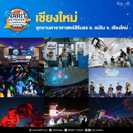 อุทยาดาราศาสตร์สิรินธร อ. แม่ริม จ. เชียงใหม่ : หนึ่งปีมีครั้งเดียวกับกิจกรรม Open House เปิดห้องปฏิบัติการเทคโนโลยีดาราศาสตร์และวิศวกรรมขั้นสูงสุดล้ำ ครั้งแรก! ที่จะเปิดให้ชม “ห้องควบคุมสถานีภาคพื้นดิน” สำหรับภารกิจดาวเทียมไทย เกาะติดภารกิจฉางเอ๋อ 7 กับ “อุปกรณ์ Payload ไทย ที่จะไปโคจรรอบดวงจันทร์” พบกับนวัตกรรมใหม่ล่าสุด “หุ่นยนต์กล้องโทรทรรศน์ 0.8 เมตร” ฝีมือคนไทย กระทบไหล่นักดาราศาสตร์ตัวจริงกับบูธงานวิจัยดาราศาสตร์หลากหลายสาขา และกิจกรรมดาราศาสตร์จัดเต็มสำหรับเด็กและครอบครัว พิเศษ! พบกับ 2 Special Talk เฉพาะที่เชียงใหม่ เอาใจคอหนัง กับ “Space on Film: ภาพยนตร์พาเราเข้าใกล้อวกาศจริงแค่ไหน” เปิดเวทีพูดคุยผ่านมุมมองผู้กำกับและนักวิชาการทางดาราศาสตร์ ร่วมถอดรหัสฉากในภาพยนตร์ชื่อดังสู่ข้อเท็จจริงทางฟิสิกส์ และอวกาศ ปลุกแรงบันดาลใจกันต่อกับ “From Dream to NARIT: ฝันอย่างไรให้ถึงจักรวาล” ล้อมวงฟังเรื่องราวแรงบันดาลใจของนักดาราศาสตร์และวิศวกร NARIT เบื้องหลังเส้นทางสู่สายอาชีพในองค์กรดาราศาสตร์ระดับประเทศ พร้อมอิ่มอร่อยตลอดทั้งวันกับ Star Market สารพันสินค้าอาหารในธีมดวงดาว ช่วงค่ำชวนมานั่งปิกนิกชมดาวเคล้าลมหนาวและเสียงดนตรี พร้อมลุ้นรับกล้องโทรทรรศน์กลับบ้าน