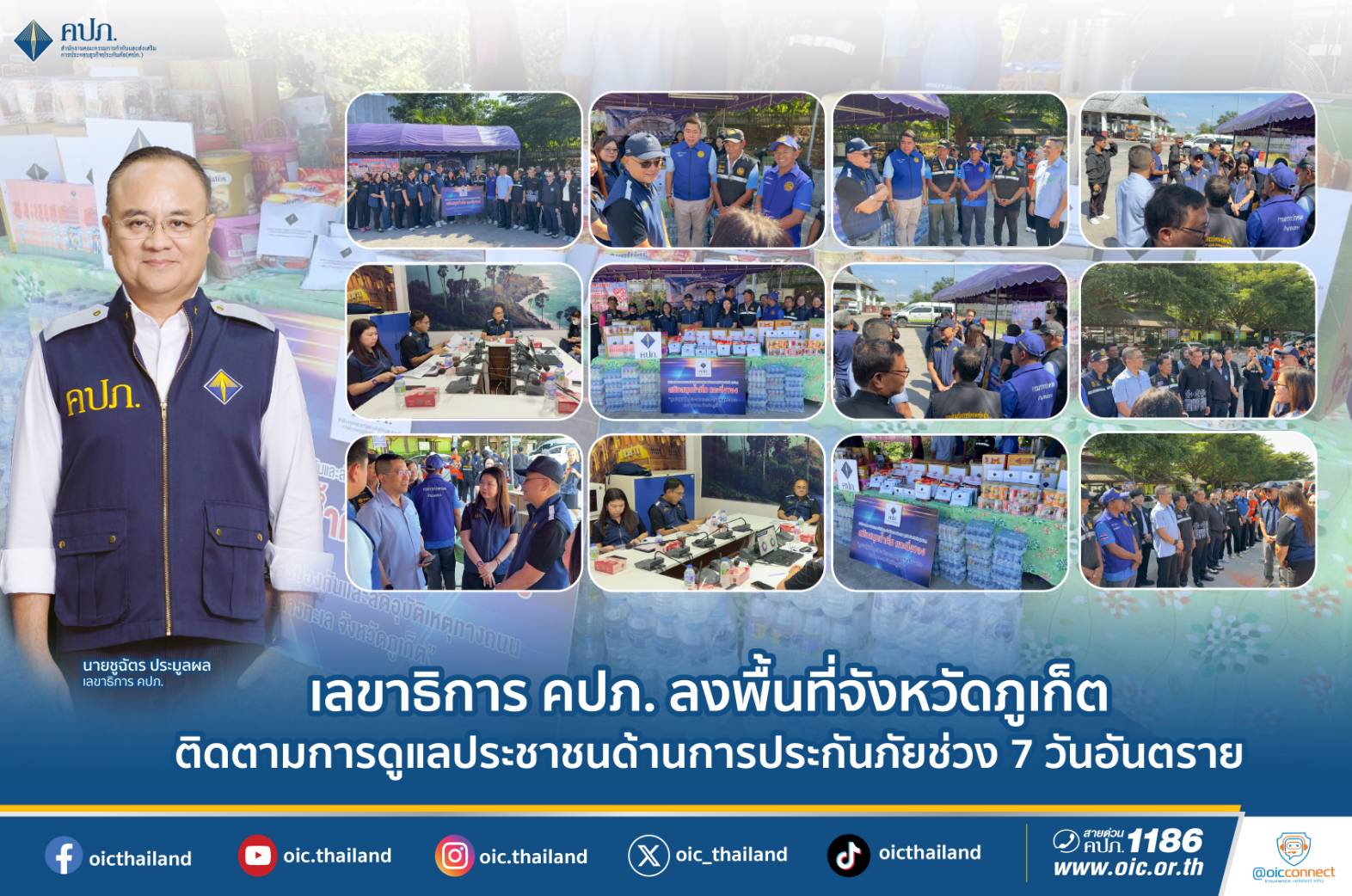 นายชูฉัตร ประมูลผล เลขาธิการคณะกรรมการกำกับและส่งเสริมการประกอบธุรกิจประกันภัย (เลขาธิการ คปภ.) เปิดเผยว่า ในช่วงเทศกาลปีใหม่ที่ผ่านมา ประชาชนจำนวนมากเดินทางกลับภูมิลำเนาและท่องเที่ยว ส่งผลให้การใช้รถใช้ถนนมีปริมาณเพิ่มขึ้น สำนักงานคณะกรรมการกำกับและส่งเสริมการประกอบธุรกิจประกันภัย (สำนักงาน คปภ.) จึงได้ติดตามสถานการณ์อย่างใกล้ชิด และดำเนินการเชิงรุกเพื่อให้ความช่วยเหลือด้านการประกันภัยแก่ประชาชนในช่วง 7 วันอันตรายระหว่างวันที่ 30 ธันวาคม 2568 ถึงวันที่ 5 มกราคม 2569 โดยบูรณาการความร่วมมือกับหน่วยงานที่เกี่ยวข้องทั้งในส่วนกลางและส่วนภูมิภาค ทั้งนี้ จากสถิติอุบัติเหตุในช่วงเทศกาลที่ผ่านมา พบว่าจังหวัดภูเก็ตเป็นพื้นที่ท่องเที่ยวสำคัญที่มีปริมาณการเดินทางของประชาชนและนักท่องเที่ยวจำนวนมาก ซึ่งมีความเสี่ยงต่อการเกิดอุบัติเหตุทางถนเลขาธิการ คปภ. ลงพื้นที่จังหวัดภูเก็ต ติดตามการดูแลประชาชนด้านการประกันภัยช่วง 7 วันอันตราย