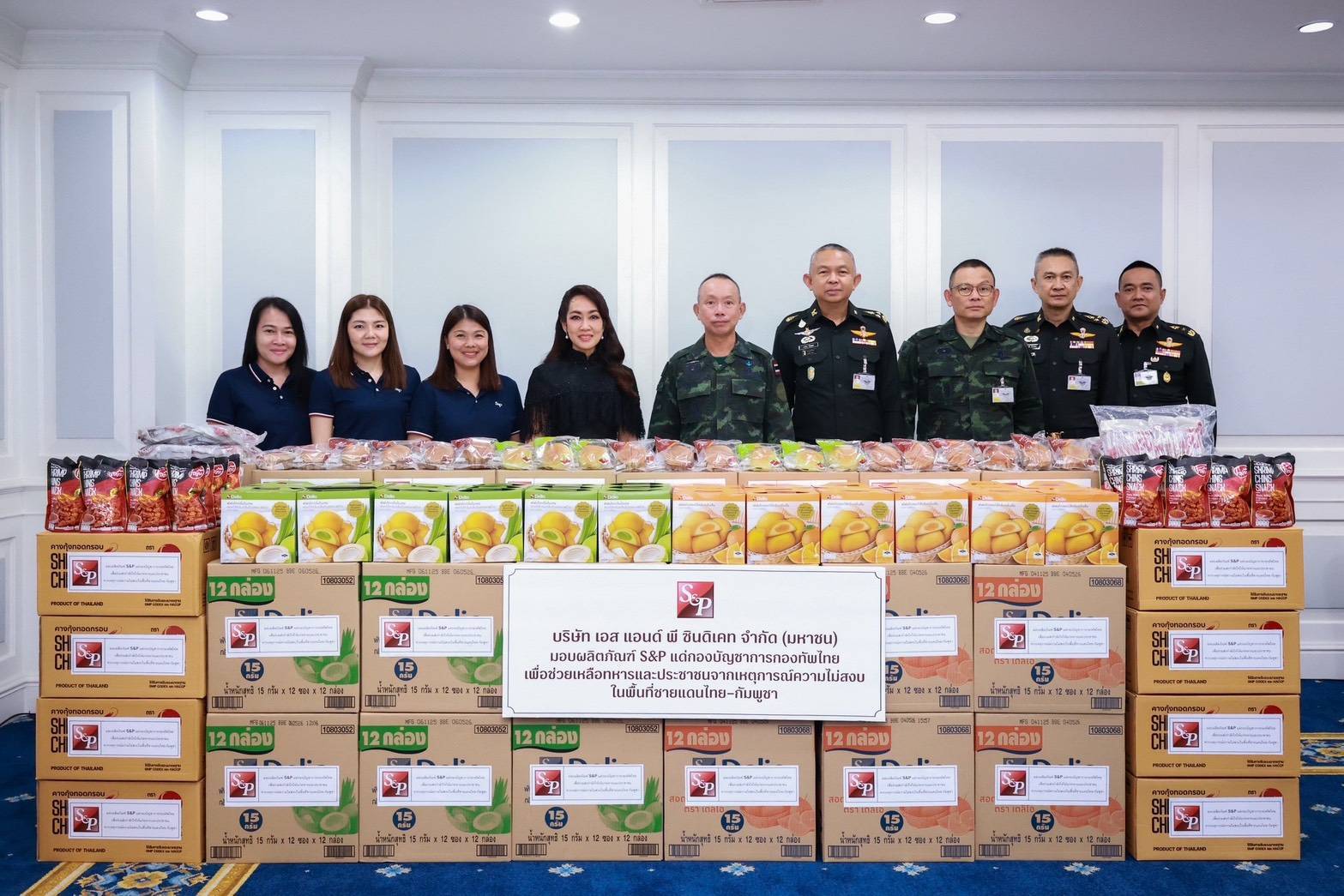 บริษัท เอส แอนด์ พี ซินดิเคท จำกัด (มหาชน) โดย คุณมณีสุดา ศิลาอ่อน ประธานเจ้าหน้าที่สำนักพัฒนาความยั่งยืนและสื่อสารองค์กร มอบผลิตภัณฑ์ S&P ได้แก่ ผลิตภัณฑ์ขนมปังรสช็อกโกแลต ผลิตภัณฑ์ขนมปังใบเตยไส้ถั่วแดง ผลิตภัณฑ์พัฟเค้กครีมกลิ่นใบเตยมะพร้าว ผลิตภัณฑ์พัฟเค้กครีมกลิ่นส้ม ผลิตภัณฑ์กุนเชียงรสซีอิ๊ว และ ผลิตภัณฑ์คางกุ้งทอดกรอบรสหมาล่า รวมจำนวน 11,172 ชิ้น มูลค่ารวม 300,228 บาท เพื่อสนับสนุนการปฏิบัติหน้าที่ของกองทัพ และร่วมส่งกำลังใจให้แก่ทหารและประชาชนที่ได้รับผลกระทบจากเหตุการณ์ความไม่สงบในพื้นที่ชายแดนไทย-กัมพูชา