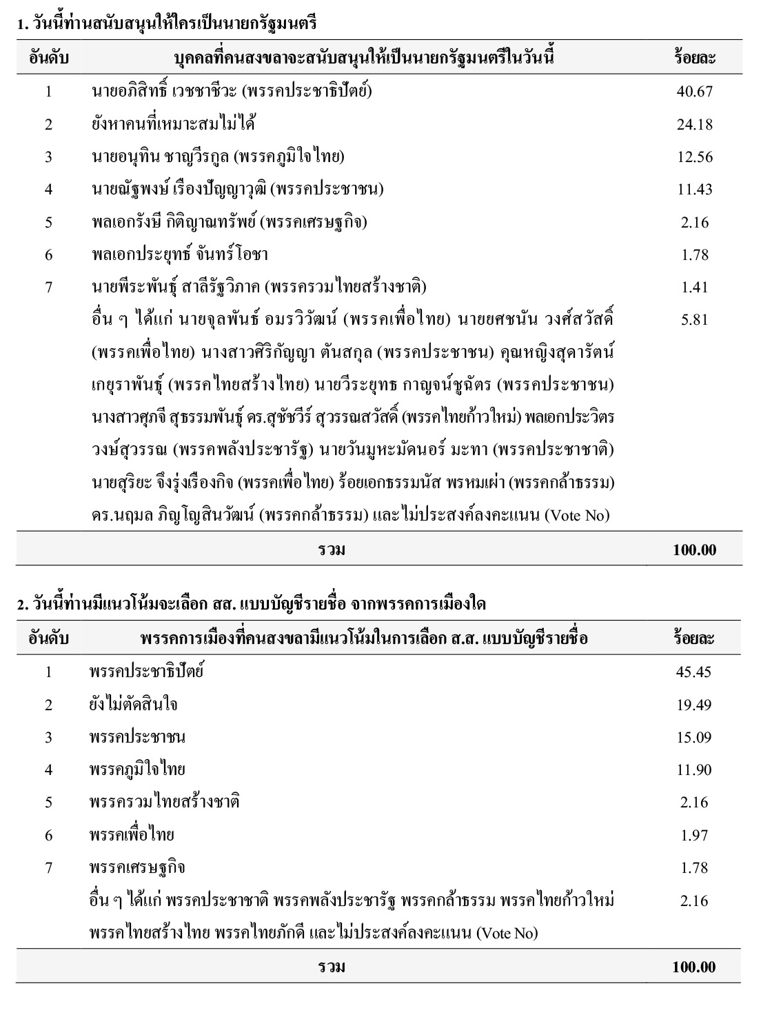 อันดับ 6 ร้อยละ 1.97 ระบุว่าเป็น พรรคเพื่อไทย อันดับ 7 ร้อยละ 1.78 ระบุว่าเป็น พรรคเศรษฐกิจ และร้อยละ 2.16 ระบุอื่น ๆ ได้แก่ พรรคประชาชาติ พรรคพลังประชารัฐ พรรคกล้าธรรม พรรคไทยก้าวใหม่ พรรคไทยสร้างไทย พรรคไทยภักดี และไม่ประสงค์ลงคะแนน (Vote No)