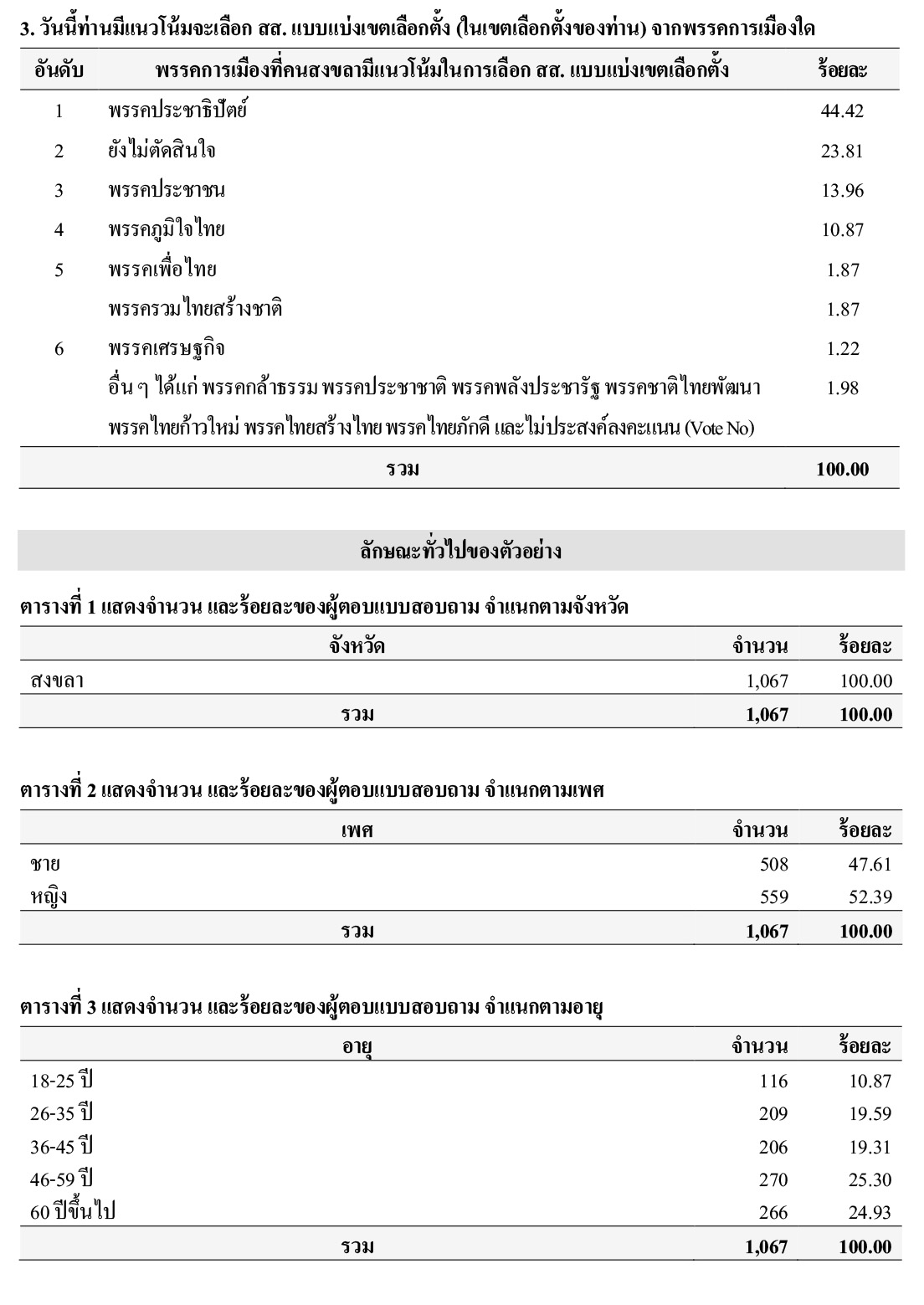ท้ายที่สุดเมื่อถามถึงพรรคการเมืองที่คนสงขลามีแนวโน้มในการเลือก สส. แบบแบ่งเขตเลือกตั้ง พบว่า อันดับ 1 ร้อยละ 44.42 ระบุว่าเป็น พรรคประชาธิปัตย์ อันดับ 2 ร้อยละ 23.81 ระบุว่า ยังไม่ตัดสินใจ อันดับ 3 ร้อยละ 13.96 ระบุว่าเป็น พรรคประชาชน อันดับ 4 ร้อยละ 10.87 ระบุว่าเป็น พรรคภูมิใจไทย อันดับ 5 ร้อยละ 1.87 ระบุว่าเป็น พรรคเพื่อไทย และพรรครวมไทยสร้างชาติ ในสัดส่วนที่เท่ากัน อันดับ 6 ร้อยละ 1.22 ระบุว่าเป็น พรรคเศรษฐกิจ และร้อยละ 1.98 ระบุอื่น ๆ ได้แก่ พรรคกล้าธรรม พรรคประชาชาติ พรรคพลังประชารัฐ พรรคชาติไทยพัฒนา พรรคไทยก้าวใหม่ พรรคไทยสร้างไทย พรรคไทยภักดี และไม่ประสงค์ลงคะแนน (Vote No)