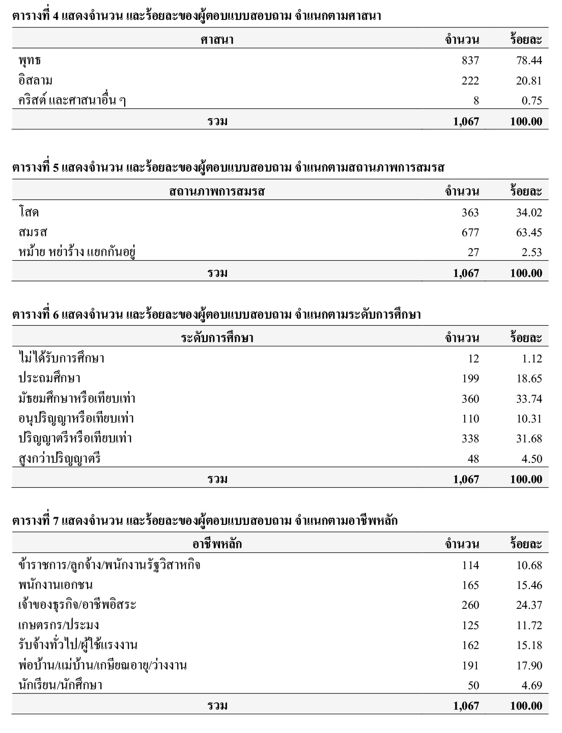 ตัวอย่าง ร้อยละ 10.87 อายุ 18-25 ปี ร้อยละ 19.59 อายุ 26-35 ปี ร้อยละ 19.31 อายุ 36-45 ปี ร้อยละ 25.30 อายุ 46-59 ปี และร้อยละ 24.93 อายุ 60 ปีขึ้นไป โดยตัวอย่าง ร้อยละ 78.44 นับถือศาสนาพุทธ ร้อยละ 20.81 นับถือศาสนาอิสลาม และร้อยละ 0.75 นับถือศาสนาคริสต์ และศาสนาอื่น ๆ