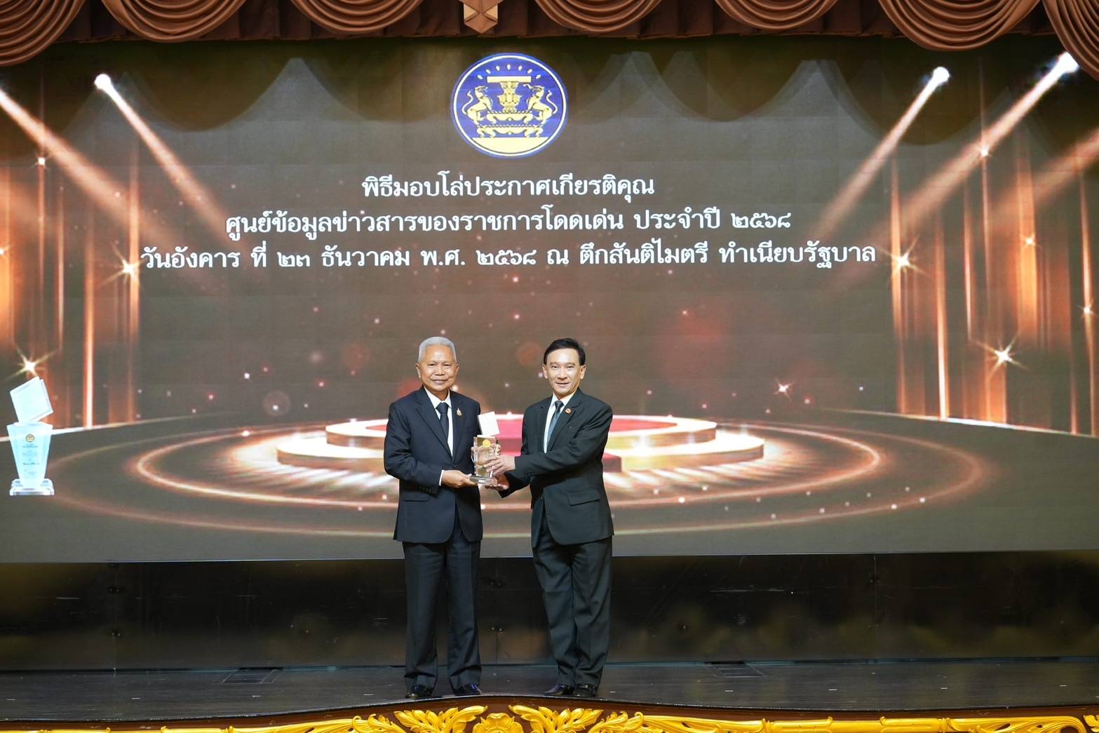 ดร.มหัทธนะ อัมพรพิสิฏฐ์ กรรมการผู้จัดการธนาคารอาคารสงเคราะห์ (ธอส.) รับมอบโล่ประกาศเกียรติคุณศูนย์ข้อมูลข่าวสารของราชการโดดเด่น ประจำปี 2568 โดยธอส.ได้รับโล่ประกาศเกียรติคุณศูนย์ข้อมูลข่าวสารของราชการโดดเด่น ประจำปี 2568 ประเภทโล่เงิน เนื่องจาก ธอส. เป็นหน่วยงานรัฐที่ผ่านเกณฑ์การประเมินศูนย์ข้อมูลข่าวสารของราชการโดดเด่นจากหน่วยงานรัฐที่เข้าร่วมทั้งสิ้น 151 หน่วยงานฯ โดยรับรางวัลฯ เป็นปีที่ 4 ติดต่อกัน (ตั้งแต่ปี 2565 - 2568) และเป็นรัฐวิสาหกิจแห่งเดียวสังกัดในกระทรวงการคลังที่ได้รับโล่ประกาศเกียรติคุณศูนย์ข้อมูลข่าวสารของราชการโดดเด่น ประจำปี 2568 ซึ่งเป็นผลจากการที่ ธอส. เป็นหน่วยงานรัฐที่มีผลการบริหารจัดการศูนย์ข้อมูลข่าวสารของราชการโดดเด่นประจำปี 2568 ดำเนินงานโดยตระหนักถึงความสำคัญของการเผยแพร่ข้อมูลข่าวสารและสิทธิในการรับรู้ข้อมูลข่าวสารของประชาชนอันเป็นสิทธิขั้นพื้นฐานและปฏิบัติตามเจตนารมณ์ของพระราชบัญญัติข้อมูลข่าวสารของราชการ พ.ศ.2540 ภายใต้หลักการ “เปิดเผยเป็นหลัก ปกปิดเป็นข้อยกเว้น” แสดงถึงหลักธรรมาภิบาล ความโปร่งใสและตรวจสอบได้ โดย ธอส.จะยังคงเดินหน้าพัฒนาปรับปรุงการให้บริการศูนย์ข้อมูลข่าวสารทางราชการในช่องทางต่าง ๆ อย่างต่อเนื่องเพื่อให้การบริการด้านข้อมูลข่าวสารกับประชาชนเป็นไปอย่างทั่วถึง รวดเร็ว ถูกต้องและทันเหตุการณ์มากขึ้น โดยมีนายโสภณ ซารัมย์ รองนายกรัฐมนตรี เป็นประธานในพิธีมอบโล่ประกาศเกียรติคุณศูนย์ข้อมูลข่าวสารของราชการโดดเด่น ประจำปีงบประมาณ พ.ศ. 2568 ณ ตึกสันติไมตรี ทำเนียบรัฐบาล เมื่อวันที่ 26 ธันวาคม 2568