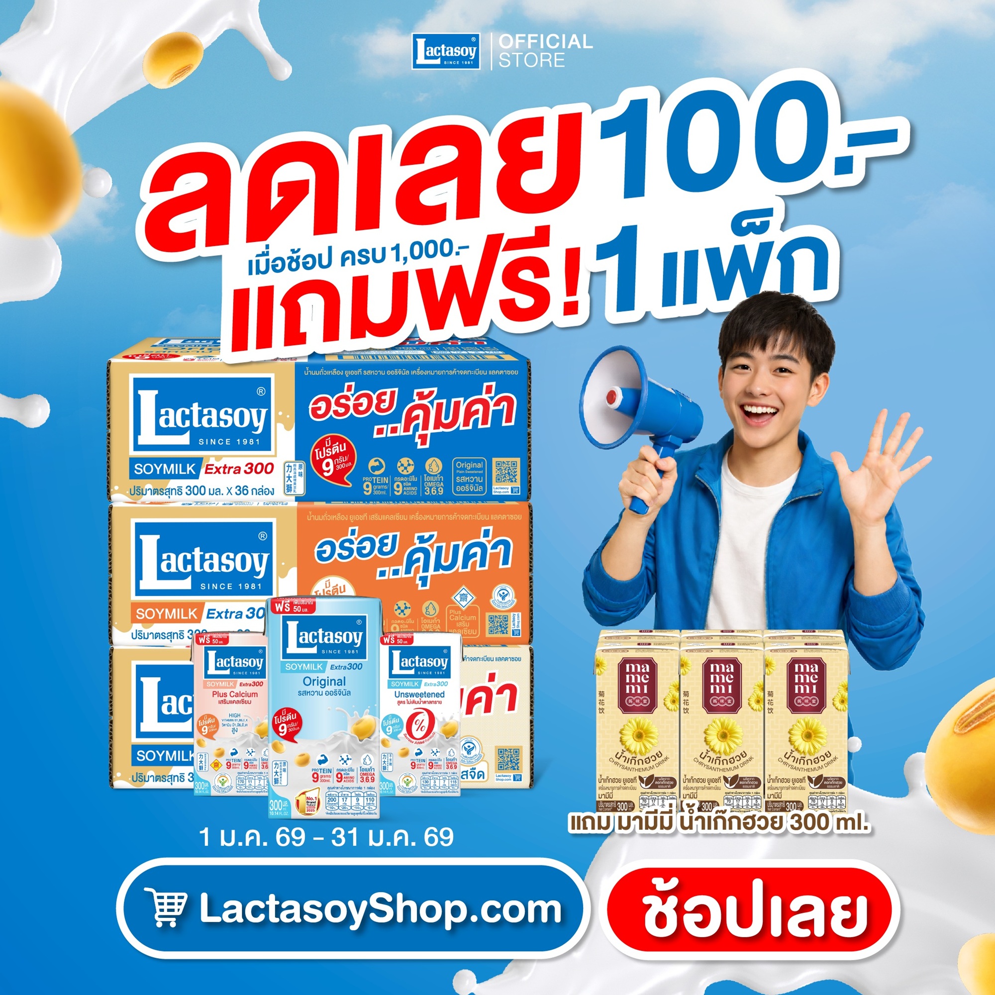 แลคตาซอย นมถั่วเหลืองแบรนด์ยอดนิยมอันดับหนึ่งในใจผู้บริโภค ผลิตจากถั่วเหลืองคุณภาพดี ดื่มได้ทุกวัน ดื่มได้ทุกเจน ชวนทุกคนมาร่วมต้อนรับปีใหม่ อิ่มอร่อยหอมมัน ได้ประโยชน์จากโปรตีนเต็ม ๆ พร้อมมีสุขภาพดีกันทั้งครอบครัว กับโปรสุดคุ้มช้อปแลคตาซอยครบ 1,000 บาท ตลอดเดือนมกราคม 2569 นี้ ลดทันที 100 บาท ยังไม่หมดเท่านี้ เพราะแลคตาซอยใจดี ร่วมสวัสดีปีใหม่แถมฟรีน้ำเก๊กฮวยมามีมี่ 300 ml. 1 แพ็คไปเลยทุกออเดอร์ รีบกดสั่งตอนนี้ก่อนโปรหมด ที่ www.lactasoyshop.com