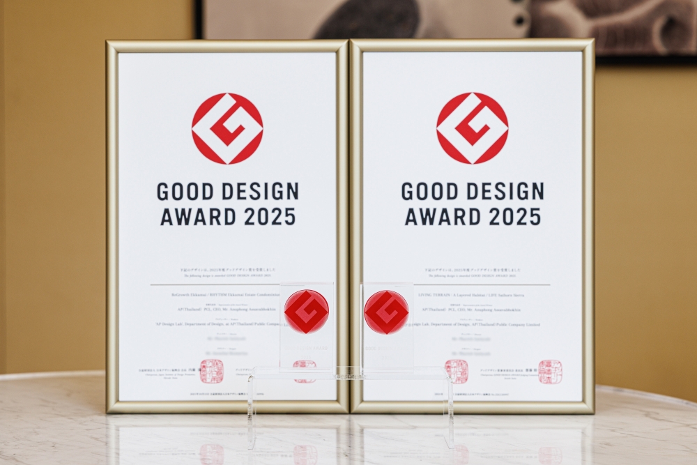 · การได้รับ 2 รางวัลจาก GOOD DESIGN AWARD ทั้ง RHYTHM Ekkamai Estate และ LIFE Sathorn Sierra จึงเปรียบเสมือนตราประทับอันทรงเกียรติที่การันตีความเป็นต้นแบบของเอพี ในการออกแบบที่อยู่อาศัยที่ให้คุณค่าสูงสุดกับคุณภาพชีวิตที่ยั่งยืน เพราะ ‘ระยะเวลา’ และ ‘การใช้งานจริง’ เท่านั้นที่สามารถพิสูจน์ความสมบูรณ์ของ Living Quality คุณภาพชีวิตและประโยชน์ที่เกิดขึ้นจริง