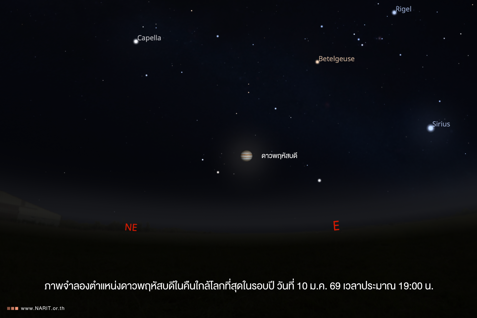 นายศุภฤกษ์ คฤหานนท์ ผู้ช่วยผู้อำนวยการ สดร. เปิดเผยว่า วันที่ 10 มกราคม 2569 ซึ่งตรงกับ วันเด็กแห่งชาติ ดาวพฤหัสบดีจะโคจรมาอยู่ในตำแหน่งตรงข้ามดวงอาทิตย์ (Jupiter Opposition) หมายถึง ตำแหน่งที่ดวงอาทิตย์ โลก และดาวพฤหัสบดี เรียงอยู่ในแนวเส้นตรงเดียวกัน มีโลกอยู่ตรงกลาง ส่งผลให้ดาวพฤหัสบดีอยู่ในตำแหน่งใกล้โลกที่สุดในรอบปี ห่างจากโลกประมาณ 633 ล้านกิโลเมตร ในวันดังกล่าว เมื่อดวงอาทิตย์ลับขอบฟ้า ดาวพฤหัสบดีจะปรากฏสว่างทางทิศตะวันออก สังเกตได้ด้วยตาเปล่า นานตลอดคืน จนถึงรุ่งเช้า หากมองผ่านกล้องโทรทรรศน์ ขนาดเส้นผ่านศูนย์กลาง 4 นิ้ว ที่มีกำลังขยายตั้งแต่ 30 เท่าขึ้นไป จะสามารถสังเกตเห็น “ดวงจันทร์กาลิเลียน” ทั้ง 4 ดวง ได้แก่ ไอโอ ยูโรปา แกนีมีด คัลลิสโต