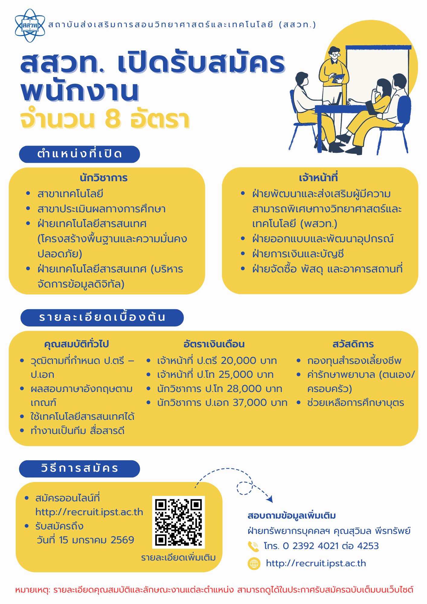 สถาบันส่งเสริมการสอนวิทยาศาสตร์และเทคโนโลยี (สสวท.) เปิดรับสมัครบุคคลเพื่อคัดเลือกเป็นพนักงาน 2 ตำแหน่ง รวมจำนวน 8 อัตรา ประกอบด้วย นักวิชาการ 4 อัตรา สาขาเทคโนโลยี สาขาประเมินผลทางการศึกษา ฝ่ายเทคโนโลยีสารสนเทศ (โครงสร้างพื้นฐานและความมั่นคงปลอดภัย) ฝ่ายเทคโนโลยีสารสนเทศ (บริหารจัดการข้อมูลดิจิทัล) และ เจ้าหน้าที่ 4 อัตรา ฝ่ายพัฒนาและส่งเสริมผู้มีความสามารถพิเศษทางวิทยาศาสตร์และเทคโนโลยี (พสวท.) ฝ่ายออกแบบและพัฒนาอุปกรณ์ ฝ่ายการเงินและบัญชี ฝ่ายจัดซื้อ พัสดุและอาคารสถานที่ ผู้สมัครต้องสำเร็จการศึกษาตั้งแต่ระดับปริญญาตรีถึงปริญญาเอก คุณสมบัติตามที่ สสวท. ประกาศ เงินเดือนเริ่มต้น 20,000–37,000 บาท พร้อมสวัสดิการกองทุนสำรองเลี้ยงชีพ ค่ารักษาพยาบาล และช่วยเหลือการศึกษาบุตร สมัครออนไลน์ได้ตั้งแต่วันนี้ถึงวันที่ 15 มกราคม 2569 ผ่านเว็บไซต์ http://recruit.ipst.ac.th สอบถามรายละเอียดที่ ฝ่ายทรัพยากรบุคคล ฯ โทร. 0 2392 4021 ต่อ 4253 (คุณสุวิมล พีรทรัพย์)