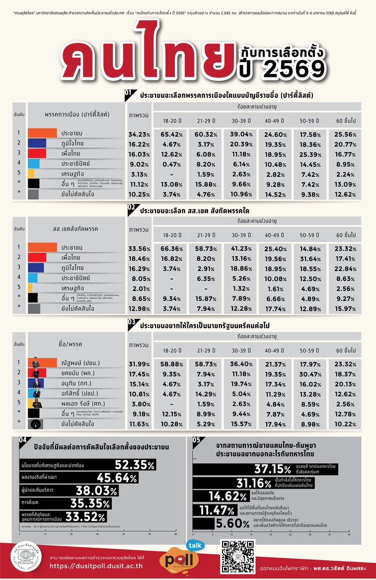 "สวนดุสิตโพล" มหาวิทยาลัยสวนดุสิต สำรวจความคิดเห็นประชาชนทั่วประเทศ เรื่อง “คนไทยกับการเลือกตั้ง ปี 2569” กลุ่มตัวอย่างจำนวน 2,682 คน (สำรวจทางออนไลน์และภาคสนาม) ระหว่างวันที่ 6-9 มกราคม 2569 พบว่า ถ้ามีการเลือกตั้ง กลุ่มตัวอย่างจะเลือกพรรคประชาชน ร้อยละ 34.23 รองลงมา คือ ภูมิใจไทย ร้อยละ 16.22 และเพื่อไทย ร้อยละ 16.03 และเลือก สส.เขตสังกัดพรรคประชาชน ร้อยละ 33.56 รองลงมาคือ เพื่อไทย ร้อยละ 18.46 และภูมิใจไทย ร้อยละ 16.29 ทั้งนี้บุคคลที่อยากให้เป็นนายกรัฐมนตรีคนต่อไป คือ ณัฐพงษ์ เรืองปัญญาวุฒิ (ปชน.) ร้อยละ 31.99 ยศชนัน วงศ์สวัสดิ์ (พท.) ร้อยละ 17.45 อนุทิน ชาญวีรกูล (ภท.) ร้อยละ 15.14 โดยปัจจัยที่มีผลต่อการตัดสินใจเลือกตั้ง คือ นโยบายที่แก้เศรษฐกิจและปากท้อง ร้อยละ 52.35 รองลงมา คือ ผลงานจริงที่ผ่านมา ร้อยละ 45.64 ทั้งนี้จากสถานการณ์ชายแดนไทย-กัมพูชา สิ่งที่อยากบอกกับทหารไทย คือ ขอสดุดี ยกย่องทหารไทยที่เสียสละทุ่มเท ร้อยละ 37.15 รองลงมาคือ เป็นกำลังใจให้ทหารไทยที่ปกป้องผืนแผ่นดินไทย ร้อยละ 31.16