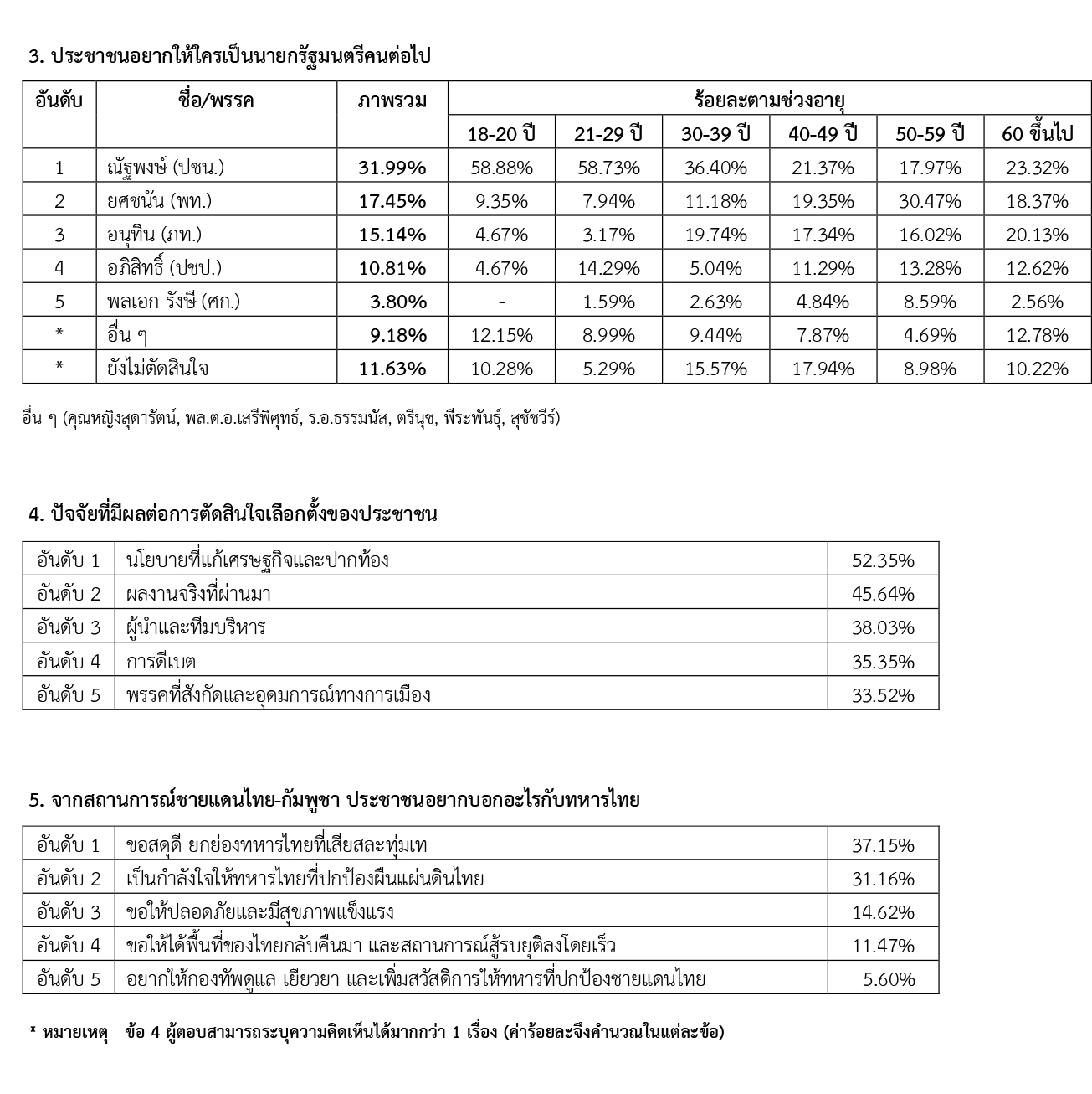 ที่ยังคงความเข้มแข็งเหนือคู่แข่ง แต่หากพิจารณาการแข่งขันระหว่างพรรคการเมืองในฝั่งอนุรักษ์นิยม โดยเฉพาะระหว่างพรรคภูมิใจไทยและพรรคเพื่อไทย จะเห็นว่าพรรคภูมิใจไทยสามารถสร้างคะแนนนิยมในระบบบัญชีรายชื่อได้เหนือกว่าพรรคเพื่อไทยเล็กน้อย แต่พรรคเพื่อไทยก็ยังคงรักษารากฐานความได้เปรียบในระบบแบ่งเขตเลือกตั้งไว้ได้ นอกจากนี้ ปัจจัยชี้ขาดทางพฤติกรรมศาสตร์ในการเลือกตั้งยังคงยึดโยงกับ “สัมฤทธิผลเชิงนโยบาย” (Policy Efficacy) เป็นสำคัญ โดยเฉพาะการแก้ไขปัญหาทางเศรษฐกิจและปัญหาปากท้องที่มีอิทธิพลต่อการตัดสินใจของประชาชนสูงถึงร้อยละ 52.35 ในขณะที่สถานการณ์ความขัดแย้งระหว่างไทย-กัมพูชา ที่แม้ประชาชนจะแสดงออกถึงการสนับสนุนกองทัพ แต่ประเด็นดังกล่าวอาจจะมิใช่ตัวแปรหลักที่จะเปลี่ยนแปลงผลการเลือกตั้งได้เท่ากับการที่รัฐบาลมีผลงานเชิงประจักษ์