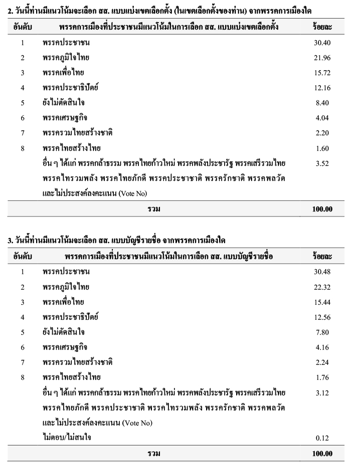 ท้ายที่สุดเมื่อถามถึงพรรคการเมืองที่ประชาชนมีแนวโน้มในการเลือก สส. แบบบัญชีรายชื่อ พบว่า อันดับ 1 ร้อยละ 30.48 ระบุว่าเป็น พรรคประชาชน อันดับ 2 ร้อยละ 22.32 ระบุว่าเป็น พรรคภูมิใจไทย อันดับ 3 ร้อยละ 15.44 ระบุว่าเป็น พรรคเพื่อไทย อันดับ 4 ร้อยละ 12.56 ระบุว่าเป็น พรรคประชาธิปัตย์ อันดับ 5 ร้อยละ 7.80 ระบุว่า ยังไม่ตัดสินใจ อันดับ 6 ร้อยละ 4.16 ระบุว่าเป็น พรรคเศรษฐกิจ อันดับ 7 ร้อยละ 2.24 ระบุว่าเป็น พรรครวมไทยสร้างชาติ อันดับ 8 ร้อยละ 1.76 ระบุว่าเป็น พรรคไทยสร้างไทย ร้อยละ 3.12 ระบุอื่น ๆ ได้แก่ พรรคกล้าธรรม พรรคไทยก้าวใหม่ พรรคพลังประชารัฐ พรรคเสรีรวมไทย พรรคไทยภักดี พรรคประชาชาติ พรรคไทรวมพลัง พรรครักชาติ พรรคพลวัต และไม่ประสงค์ลงคะแนน (Vote No) และร้อยละ 0.12 ระบุว่า ไม่ตอบ/ไม่สนใจ