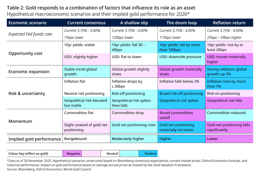 ทองคำได้สร้างปรากฏการณ์อันน่าทึ่งในปี 2568 ด้วยการทำสถิติสูงสุดใหม่กว่า 50 ครั้ง และสร้างผลตอบแทนรายปีเพิ่มขึ้นมากกว่า 60% นับเป็นผลตอบแทนรายปีที่แข็งแกร่งที่สุดตั้งแต่ปี 2514 แม้ว่าการประมาณการของตลาดโดยรวมในปัจจุบันชี้ว่าราคาทองคำจะเคลื่อนไหวในกรอบ (range-bound)[1] แต่ประวัติศาสตร์ได้ชี้ให้เห็นว่าเศรษฐกิจมหภาคมักไม่ได้เป็นไปตามที่ตลาดคาดการณ์ คุณเซาไก ฟาน (Shaokai Fan) หัวหน้าภูมิภาคเอเชียแปซิฟิก (ไม่รวมประเทศจีน) และหัวหน้าฝ่ายธนาคารกลางระดับโลก ของสภาทองคำโลก ได้วิเคราะห์ 3 สถานการณ์สำหรับทองคำ โดยครอบคลุมผลกระทบทั้งในเชิงบวกปานกลาง เชิงบวกสูง และเชิงลบ