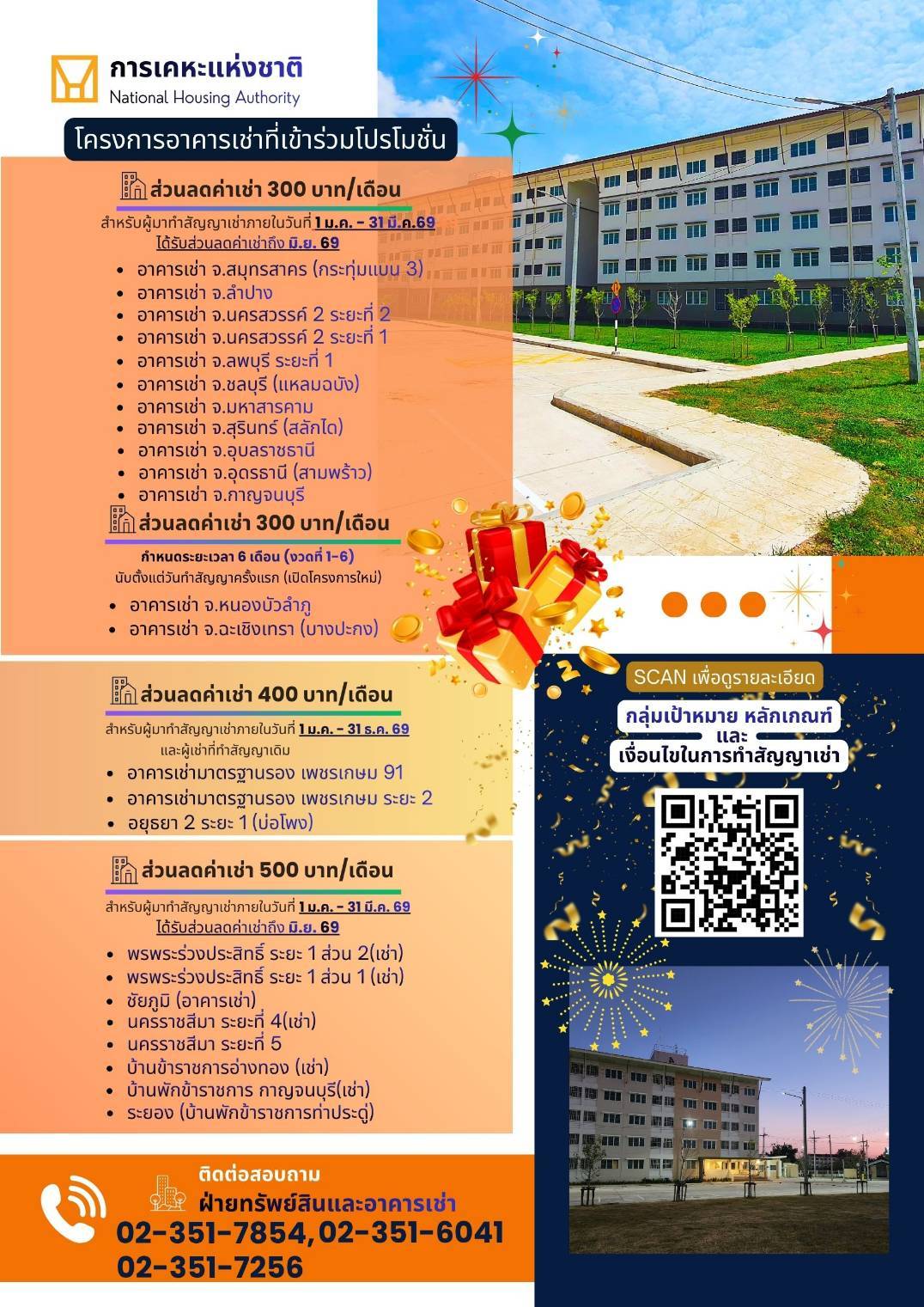 สำหรับส่วนลด 400 บาทต่อเดือน ผู้ที่มาทำสัญญาเช่าภายในเดือนมกราคม – 31 ธันวาคม 2569 ได้แก่ อาคารเช่ามาตรฐานรอง เพชรเกษม 91, อาคารเช่ามาตรฐานรอง เพชรเกษม ระยะ 2 และอยุธยา 2 ระยะ 1 (บ่อโพง) สำหรับโครงการเช่าที่จะได้รับส่วนลด 500 บาทต่อเดือน ได้แก่ พรพระร่วงประสิทธิ์ ระยะ 1 ส่วน 1-2 (เช่า), ชัยภูมิ (อาคารเช่า), นครราชสีมา ระยะที่ 4 (เช่า) นครราชสีมา ระยะที่ 5, บ้านข้าราชการอ่างทอง (เช่า), บ้านพักข้าราชการ กาญจนบุรี (เช่า), และระยอง (บ้านพักข้าราชการท่าประดู่) ให้กับผู้ที่มาทำสัญญาตั้งแต่เดือนมกราคม ถึง 31 มีนาคม 2569 จะได้รับส่วนลดค่าเช่าถึงเดือนมิถุนายน 2569