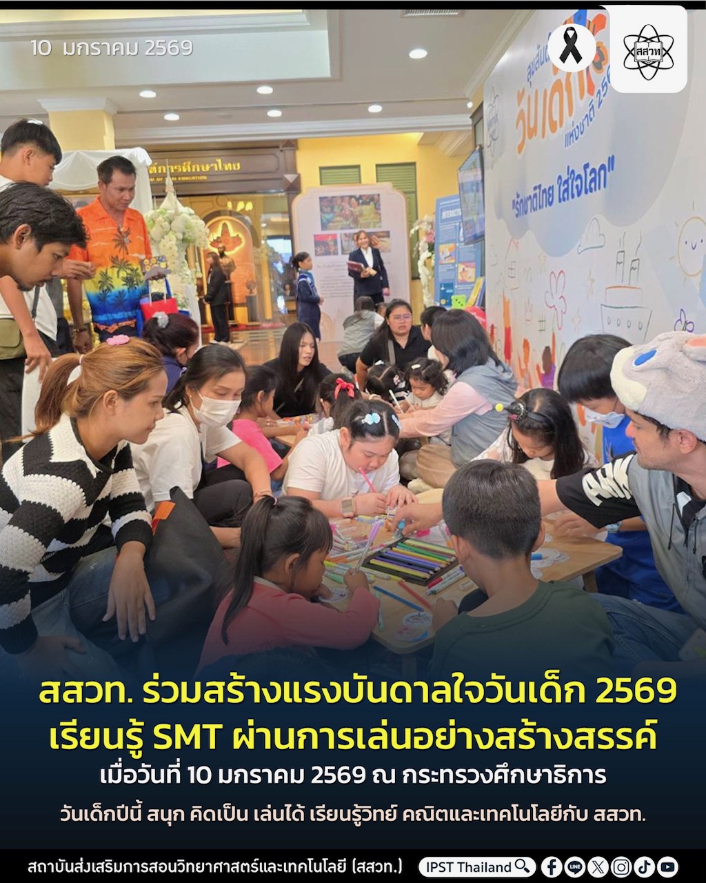สถาบันส่งเสริมการสอนวิทยาศาสตร์และเทคโนโลยี (สสวท.) ร่วมจัดกิจกรรมในงานวันเด็กแห่งชาติ ประจำปี 2569 เมื่อวันที่ 10 มกราคม 2569 ณ อาคารราชวัลลภ กระทรวงศึกษาธิการ การจัดกิจกรรมงานวันเด็กแห่งชาติ ณ กระทรวงศึกษาธิการในครั้งนี้ ได้รับเกียรติจาก ร้อยเอก ธรรมนัส พรหมเผ่า รองนายกรัฐมนตรีและรัฐมนตรีว่าการกระทรวงเกษตรและสหกรณ์ เป็นประธานในพิธีเปิด ร่วมด้วย ศาสตราจารย์นฤมล ภิญโญสินวัฒน์ รัฐมนตรีว่าการกระทรวงศึกษาธิการ พร้อมด้วยนายองอาจ วงษ์ประยูร รัฐมนตรีช่วยว่าการกระทรวงศึกษาธิการ และคณะผู้บริหาร ศธ. ผู้ปกครอง นักเรียน นักศึกษา เข้าร่วมในกิจกรรมวันเด็กแห่งชาติของกระทรวงศึกษาธิการ