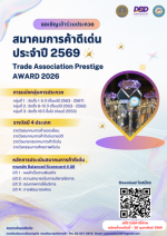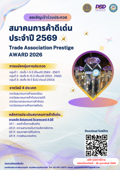 กรมพัฒนาธุรกิจการค้า เชิญชวนสมาคมการค้าทั่วประเทศเข้าร่วมประกวด“สมาคมการค้าดีเด่น” ประจำปี 2569 (Trade Association Prestige AWARD 2026) เพื่อคัดเลือกและเชิดชูเกียรติสมาคมการค้าที่มีการบริหารจัดการองค์กรอย่างมีประสิทธิภาพ มีบทบาทสำคัญในการพัฒนาและขับเคลื่อนธุรกิจไทย ส่งเสริมและยกระดับการบริหารจัดการองค์กรสู่มาตรฐานสากล เปิดรับสมัครตั้งแต่บัดนี้ จนถึง 28 กุมภาพันธ์ 2569 ฟรี!!! ไม่มีค่าใช้จ่าย