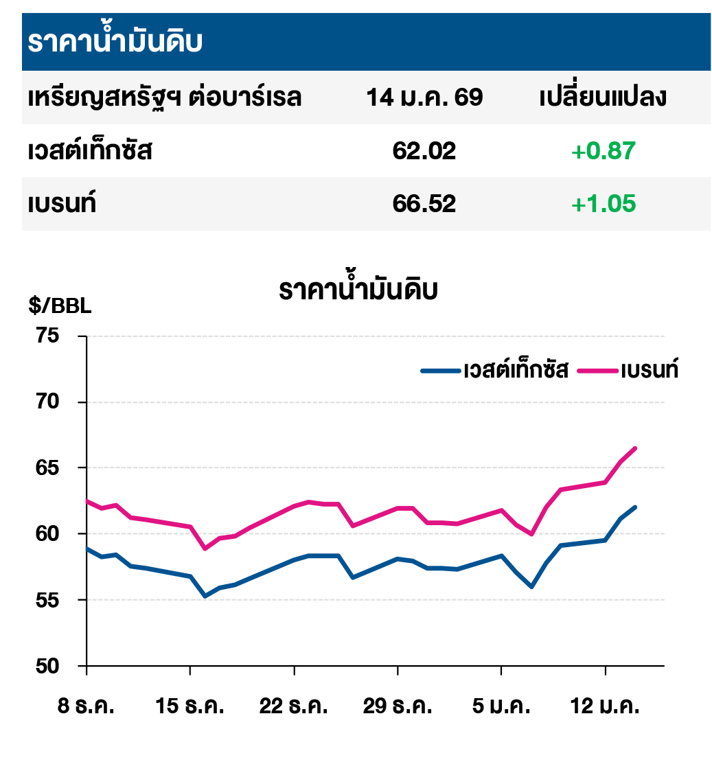 (+/-) ราคาน้ำมันดิบเวสต์เท็กซัสและเบรนท์ปรับเพิ่มขึ้น  หลังสำนักข่าวรอยเตอร์ (Reuters) รายงานว่าเจ้าหน้าที่ทหารของสหรัฐฯ ซึ่งประจำการอยู่ที่ฐานทัพ AlUdeid ในกาตาร์ ได้รับคำสั่งให้เริ่มอพยพออกจากฐานทัพ ส่งผลให้ตลาดกังวลว่าการเคลื่อนไหวดังกล่าวเป็นการเตรียมความพร้อมในการโจมตีอิหร่านของสหรัฐฯ อย่างไรก็ดี นายโดนัลด์ ทรัมป์ ประธานาธิบดีสหรัฐฯ ออกมากล่าวกับผู้สื่อข่าวที่ทำเนียบขาวในช่วงเย็นว่า เขาได้รับการยืนยันจากอิหร่านว่าอิหร่านจะยุติการปราบปรามผู้ประท้วง ซึ่งเป็นสัญญาณว่าสหรัฐฯ อาจชะลอมาตรการตอบโต้ทางทหารซึ่งขู่ไว้ก่อนหน้านี้