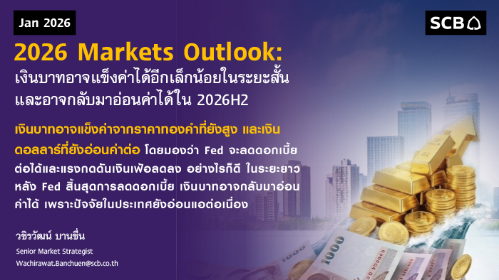 กลุ่มงานตลาดการเงิน ธนาคารไทยพาณิชย์ (SCB Financial Markets: SCB FM) เปิดเผยว่า เงินบาทในเดือนนี้ผันผวนมากขึ้น โดยแข็งค่าเร็วตามราคาทองคำที่ปรับสูงขึ้นแรง แต่กลับมาอ่อนค่าได้หลังมีข่าวเกี่ยวกับการดำเนินนโยบายในตลาดการเงินของไทย สำหรับในช่วงครึ่งปีแรก คาดว่าเงินบาทอาจแข็งค่าต่อได้ หาก Fed ลดดอกเบี้ยตามที่คาด และราคาทองคำยังสูงขึ้นต่อตามความเสี่ยงเรื่องสงครามในต่างประเทศ อย่างไรก็ดี เงินบาทมีโอกาสกลับมาอ่อนค่าได้ในช่วงครึ่งปีหลัง หากการลดดอกเบี้ยของ Fed จบลง เงินทุนเคลื่อนย้ายไหลเข้า EM รวมถึงไทยน้อยลง และเศรษฐกิจไทยยังอ่อนแอตามที่คาด นอกจากนี้ ความไม่แน่นอนทางการเมืองอาจเป็นปัจจัยเสี่ยงทำให้เงินบาทกลับมาอ่อนค่าได้ในบางช่วง มองกรอบเงินบาทต่อดอลลาร์สหรัฐในช่วง 1 เดือนนี้ที่ราว 31.10-31.60