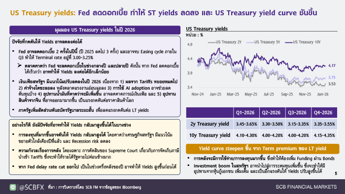 สำหรับมุมมองนโยบายการเงินไทยคาดว่า กนง. จะลดดอกเบี้ยนโยบายลงไปอยู่ที่ 1% ภายในกลางปีนี้ และทรงตัวต่ำนานถึงปี 2027 เพื่อช่วยประคองเศรษฐกิจที่มีแนวโน้มเติบโตต่ำมากต่อเนื่อง สำหรับมุมมองของผู้เล่นในตลาดการเงินนั้น ตลาดให้โอกาสเพียง 40-50% ที่ กนง. จะลดดอกเบี้ยอีก 1 ครั้งในปีนี้ และพบว่าอัตราผลตอบแทนพันธบัตรรัฐบาลไทยปรับสูงขึ้นในช่วงที่ผ่านมาจากอุปสงค์ของนักลงทุนที่เบาบางลง ขณะที่อุปทานพันธบัตรรัฐบาลและหุ้นกู้กลุ่มค่าน่าเชื่อถือสูงมีออกมามากขึ้นในช่วงที่ผ่านมา ทั้งนี้หาก กนง. ลดดอกเบี้ยนโยบายตามที่ประเมิน ก็จะกดดันให้ Short-term bond yields ปรับลดลงมาได้