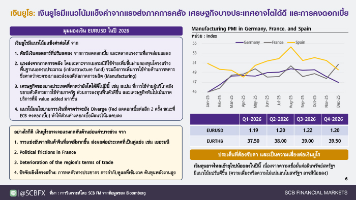 สำหรับมุมมองสกุลเงินอื่นในปีนี้ มองว่าเงินยูโรและเงินหยวนมีแนวโน้มแข็งค่าเทียบต่อเงินดอลลาร์สหรัฐ และอาจแข็งค่าเทียบต่อเงินบาทเช่นกัน โดยเงินยูโรมีแนวโน้มแข็งค่าต่อได้ จาก 1) ดัชนีเงินดอลลาร์ที่ปรับอ่อนค่าลง 2) แรงส่งจากภาคการคลัง โดยเฉพาะจากเยอรมนีที่ใช้จ่ายเพิ่มขึ้นผ่านกองทุนโครงสร้างพื้นฐานนอกงบประมาณ รวมถึงการเพิ่มการใช้จ่ายด้านการทหาร ซึ่งคาดว่าจะส่งผลดีต่อภาคการผลิต (Manufacturing) 3) เศรษฐกิจของบางประเทศที่คาดว่ายังโตได้ดีในปีนี้ เช่น สเปน ที่การใช้จ่ายผู้บริโภคยังขยายตัวดีตามการใช้จ่ายภาครัฐ และเศรษฐกิจหันไปเน้นภาคบริการที่มี value-added มากขึ้น และ 4) ส่วนต่างดอกเบี้ยมีแนวโน้มแคบลง เพราะ Fed อาจลดดอกเบี้ยต่ออีก 2 ครั้ง ขณะที่ ECB น่าจะคงดอกเบี้ยในปีนี้ ทำให้มองว่า เงินยูโรเทียบต่อบาทอาจแข็งค่าขึ้นไปที่ราว 37.00-37.50 ภายในไตรมาสแรกของปีนี้ อย่างไรก็ดี เงินยูโรอาจเจอแรงกดดันด้านอ่อนค่าบางช่วง จากความไม่แน่นอนทางการเมืองในบางประเทศ เช่น ฝรั่งเศส
