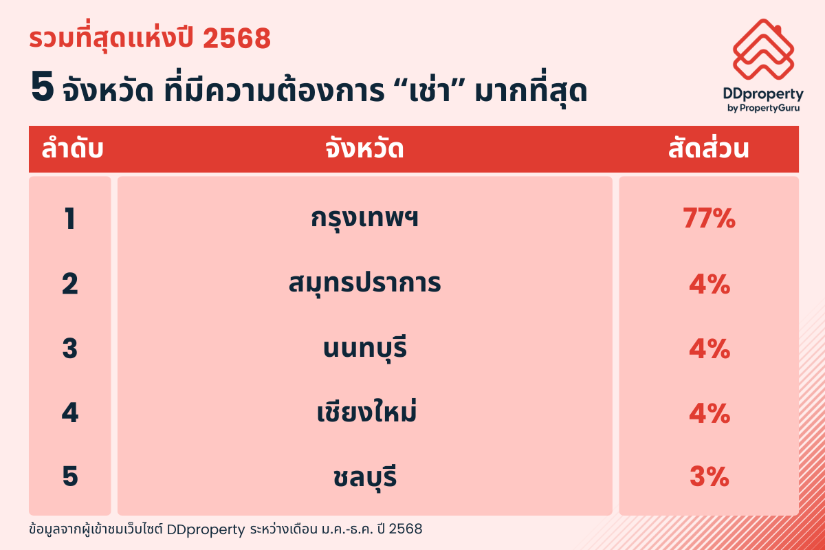 สำหรับ 5 จังหวัดที่มีความต้องการเช่ามากที่สุดในรอบปี 2568 ได้แก่