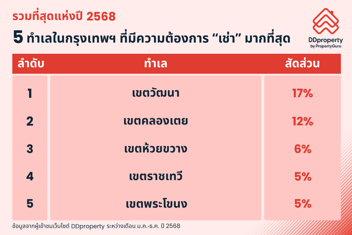 ขณะที่ 5 ทำเลที่มีความต้องการเช่ามากที่สุดในรอบปี 2568 ได้แก่
