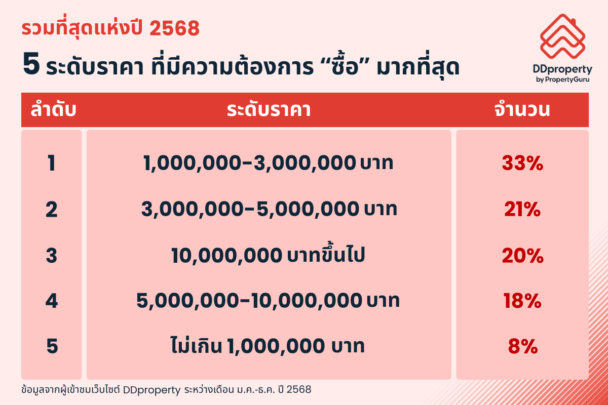 โดยระดับราคาที่อยู่อาศัยที่ชาวไทยมีความต้องการซื้อมากที่สุดในรอบปี 2568 ได้แก่