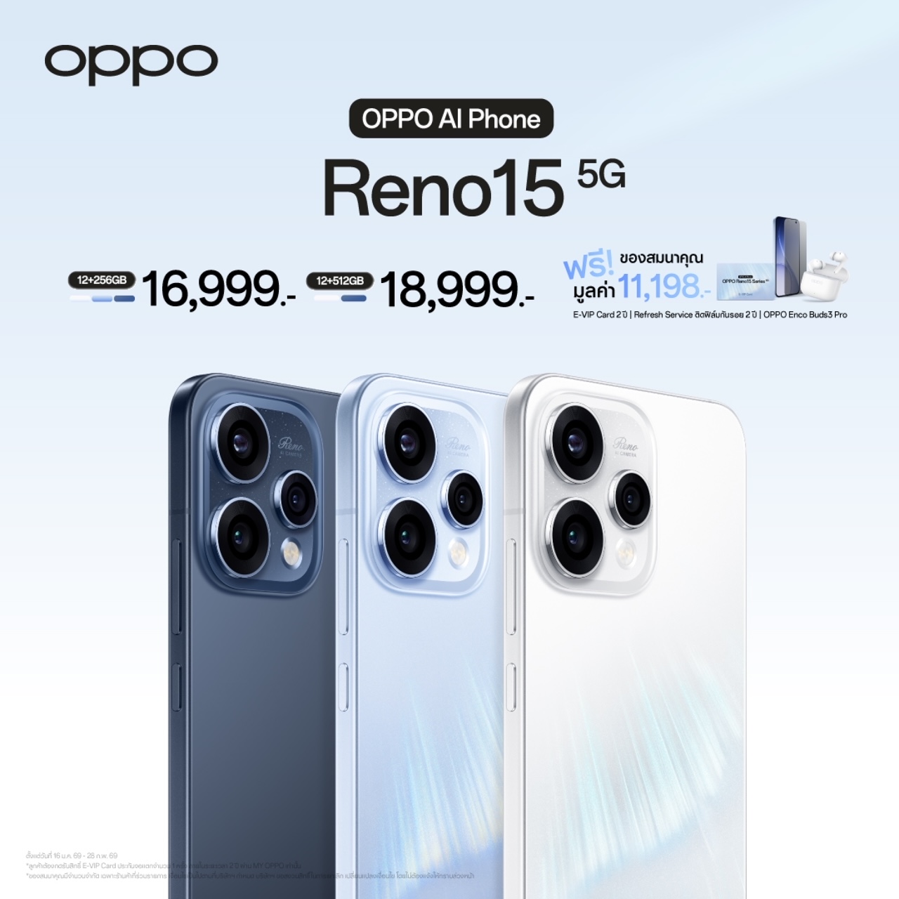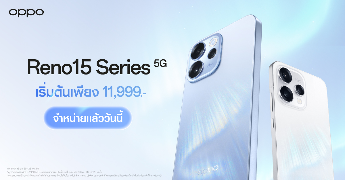 OPPO ประกาศวางจำหน่าย "OPPO Reno15 Series 5G" สมาร์ตโฟนเพื่อนซี้ เทรนดี้ทุกช็อต รุ่นใหม่ล่าสุด วางจำหน่ายในราคาสุดคุ้ม เริ่มต้นเพียง 11,999 บาท มาพร้อมโปรโมชั่นสุดพิเศษในช่วงวันนี้ - 28 กุมภาพันธ์ 2569 อีกทั้งยังมอบทุกประสบการณ์การใช้งานด้วย 2 ผลิตภัณฑ์ IoT ใหม่ อย่าง OPPO Watch S วางจำหน่ายในราคาเริ่มต้น 5,999 บาท และ OPPO Pad 5 ในราคาเริ่มต้น 13,999 บาท