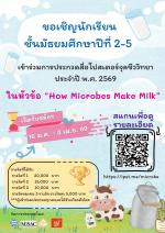 สถาบันส่งเสริมการสอนวิทยาศาสตร์และเทคโนโลยี (สสวท.) ร่วมกับ Microbiology in Schools Advisory Committee (MiSAC, สหราชอาณาจักร) ขอเชิญนักเรียนระดับมัธยมศึกษาปีที่ 2-5 ส่งผลงานเข้าร่วมการประกวดสื่อโปสเตอร์จุลชีววิทยา ประจำปี พ.ศ. 2569 ในหัวข้อ "บทบาทของจุลินทรีย์ในการช่วยสร้างน้ำนมวัว How Microbes Make Milk" เพื่อส่งเสริมความรู้ความเข้าใจเกี่ยวกับบทบาทของจุลินทรีย์ในกระบวนการสร้างน้ำนม สร้างแรงบันดาลใจด้านวิทยาศาสตร์และเทคโนโลยี และตระหนักถึงความสำคัญของเกษตร โภชนาการ และการพัฒนาที่ยั่งยืน ผู้ชนะเลิศจะได้รับเงินรางวัล และผู้เข้าร่วมประกวดทุกคนจะได้รับเกียรติบัตร เปิดรับสมัครและส่งผลงานได้ตั้งแต่วันที่ 16 มกราคม – 3 เมษายน 2569 ที่ https://forms.gle/c4n4YxUijrHiRyMb9 ดูรายละเอียดเพิ่มเติมที่ https://www.ipst.ac.th/microbecontest สอบถามข้อมูลเพิ่มเติมได้ที่ wrata@ipst.ac.th