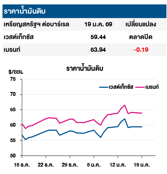 (-) ราคาน้ำมันดิบเบรนท์ปรับลดลง หลังตลาดกังวลต่อสถานการณ์ความตึงเครียดทางการค้าระหว่างสหรัฐฯ และสหภาพยุโรป ซึ่งอาจส่งผลกระทบต่อการขยายตัวของเศรษฐกิจและความต้องการใช้น้ำมัน หลังรัฐบาลสหรัฐฯ ประกาศใช้มาตรภาษีเพิ่มเติมอีก 10% กับสหราชอาณาจักร, ฝรั่งเศส, เยอรมนี, เนเธอร์แลนด์, ฟินแลนด์, เดนมาร์ก, นอร์เวย์และสวีเดน เพื่อตอบโต้ชาติในยุโรปซึ่งเห็นต่างกับสหรัฐฯ ในการเข้ายึดครองเกาะกรีนแลนด์ โดยมาตรภาษีดังกล่าวจะมีผลบังคับใช้นับตั้งแต่วันที่ 1 ก.พ. 69 และอัตราภาษีจะปรับขึ้นสู่ระดับ 25% ในเดือน มิ.ย. 69 หากสหรัฐฯ ยังไม่สามารถเข้าครอบครองเกาะกรีนแลนด์ได้ โดยล่าสุด นายสก็อตต์ เบสเซนต์ รัฐมนตรีคลังสหรัฐฯ กล่าวว่า ความเปราะบางของชาติในยุโรปเป็นเหตุผลสำคัญที่สหรัฐฯ จำเป็นต้องเข้ามาควบคุมเพื่อรักษาเสถียรภาพของโลก